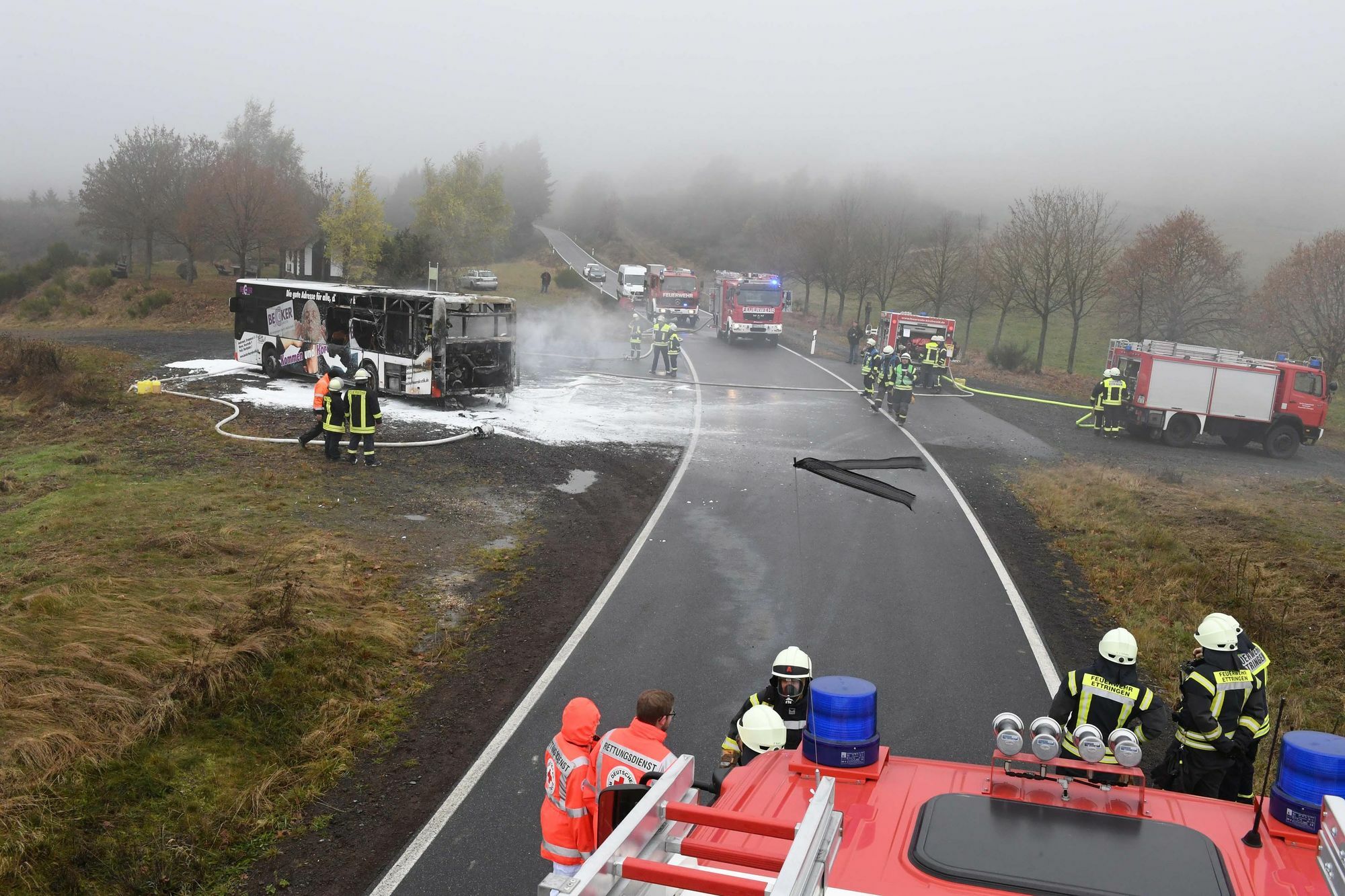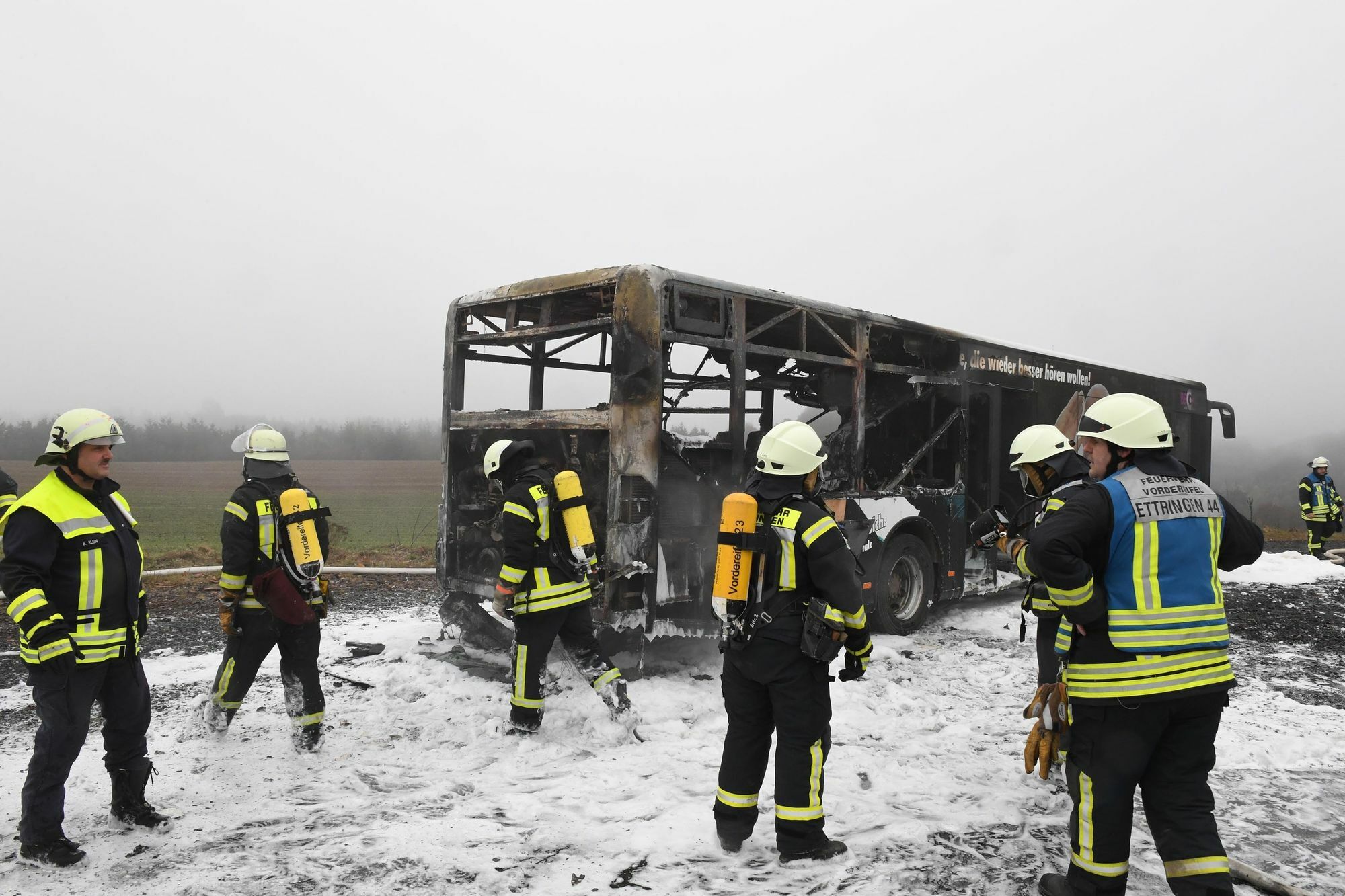 Als der Busfahrer in Kirchwald Brandgeruch bemerkte, ließ er die sechs im Bus verbliebenen Schulkinder direkt aussteigen. Dann fuhr er den Bus auf eine Freifläche jenseits der Ortslage. Im Einsatz waren die Freiwilligen Feuerwehren Kirchwald, Langenfeld und Ettringen. Brandursache könnte nach einer ersten Einschätzung der Polizei ein technischer Defekt gewesen sein. Foto: Walz