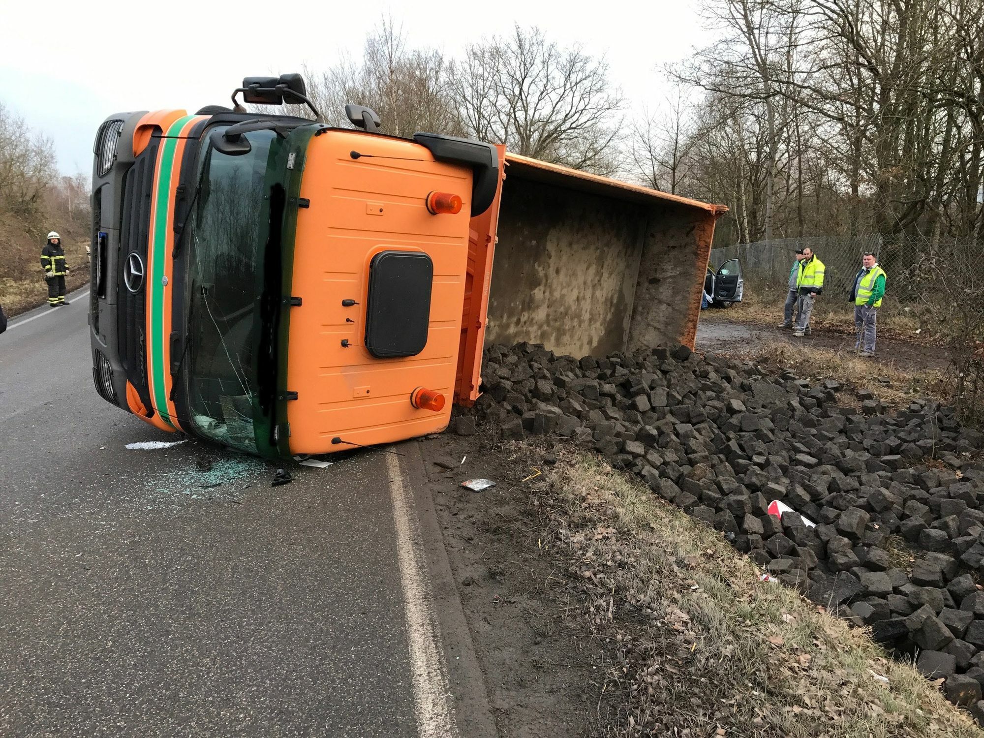 Nach den bisherigen Ermittlungen der Polizei kam der Fahrer mit seinem Lkw in einer langgezogenen Linkskurve aus bislang nicht geklärter Ursache auf den Grünstreifen. Bei dem Versuch Gegenzulenken, schaukelte sich der Lastwagen vermutlich auf, schleuderte quer über die Fahrbahn und kippte um. Eine entgegenkommende Pkw-Fahrerin reagierte noch geistesgegenwärtig und lenkte ihr Auto in einen Feldweg, um dem Lkw auszuweichen - eine leichte Kollision konnte allerdings nicht mehr vermieden werden. Bei dem Verkehrsunfall kam es glücklicherweise zu keinem Personenschaden. Der entstandene Sachschaden dürfte sich, ersten Schätzungen zufolge, auf rund 37.000 Euro belaufen. Die K 21 musste während der Verkehrsunfallaufnahme beziehungsweise der Bergung des LKW für circa 90 Minuten voll gesperrt werden. Im Einsatz waren neben der Polizei, die Straßenmeisterei, die Freiwillige Feuerwehr Mayen sowie ein Abschleppunternehmen. Foto: Walz