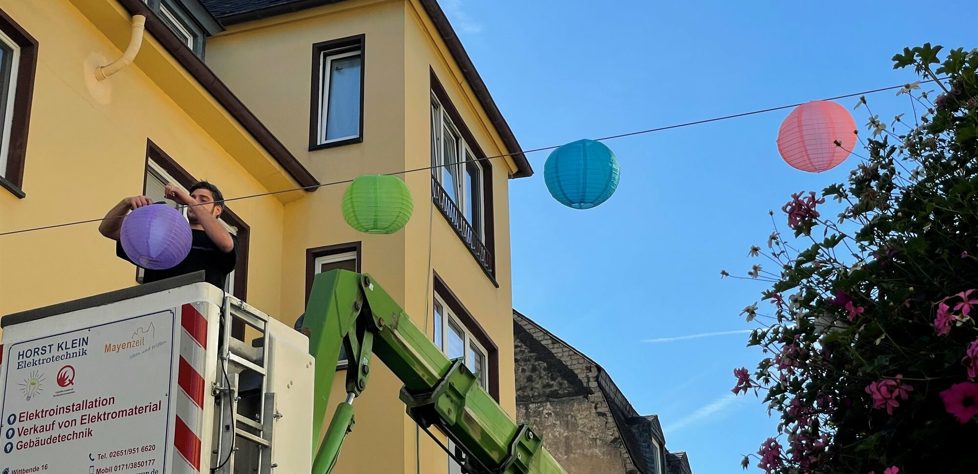 Pünktlich zum Stein- und Burgfest wird die Mayener Innenstadt aufgehübscht - und zwar mit bunten Lampions, die über den Straßen platziert werden. Sie werden die nächsten drei Monate hängenbleiben. Diese Initiative geht von der MY-Gemeinschaft aus. »Bunt passt nicht nur zum Stein- und Burgfest, sondern auch zum Lukasmarkt und zu St. Martin«, erläutert Jürgen Nett, Vorsitzender der MY-Gemeinschaft auf Nachfrage des WochenSpiegel. Im Anschluss folgt die Weihnachtsbeleuchtung.