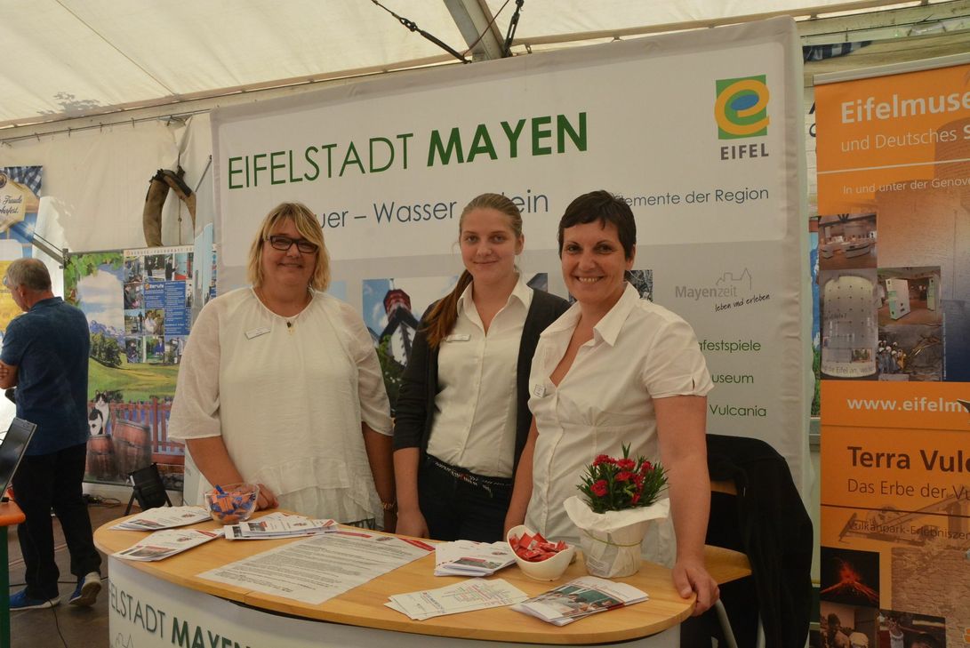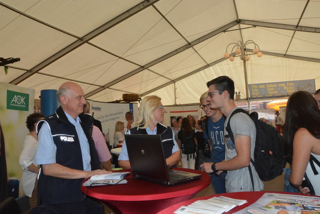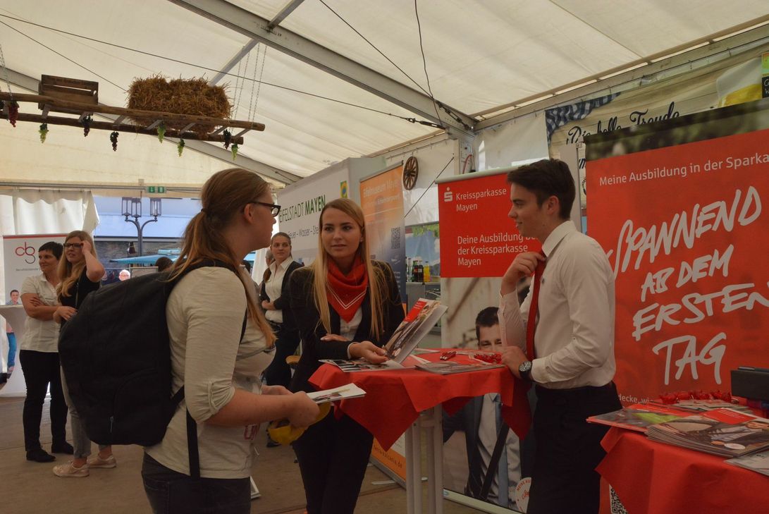 Wer heute in Mayen unterwegs ist, fragt sich vielleicht, warum so viele junge Menschen mit gelben Kappen in den Straßen unterwegs sind. Für "I-Dötzchen" sind die meistens von ihnen dann doch etwas groß. Den Grund für die gelbe Kopfbedeckung findet sich auf dem Marktplatz. Dort stellt das Technische Hilfswerk im Rahmen des "Tages der Behörden" seine Tätigkeitsfelder und Ausbildungsmöglichkeiten vor und verteilt an Interessierte Gelbe Kappen als Werbegeschenke. Doch auch viele andere Firmen haben im Festzelt und auf dem Marktplatz ihre Stände aufgebaut. So sind auch HoeV, Amtsgericht, Finanzamt, Jobcenter, Polizei, BBS, Gesundheitsamt, KSK, Stadtverwaltung, Arbeitsagentur, AOK, THW, Bundeswehr, Feuerwehr, Vermessungs- und Katasteramt, DRK, Komm-Aktiv, , Funkamateure im Deutschen Amateur Radio Club e.V vertreten. Noch bis 18 Uhr können sich Interessierte dort über Ausbildungsmöglichkeiten informieren.
