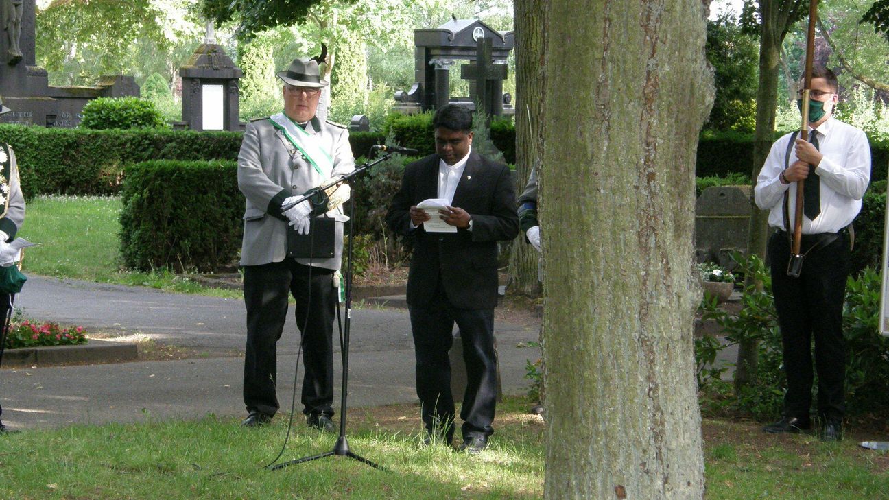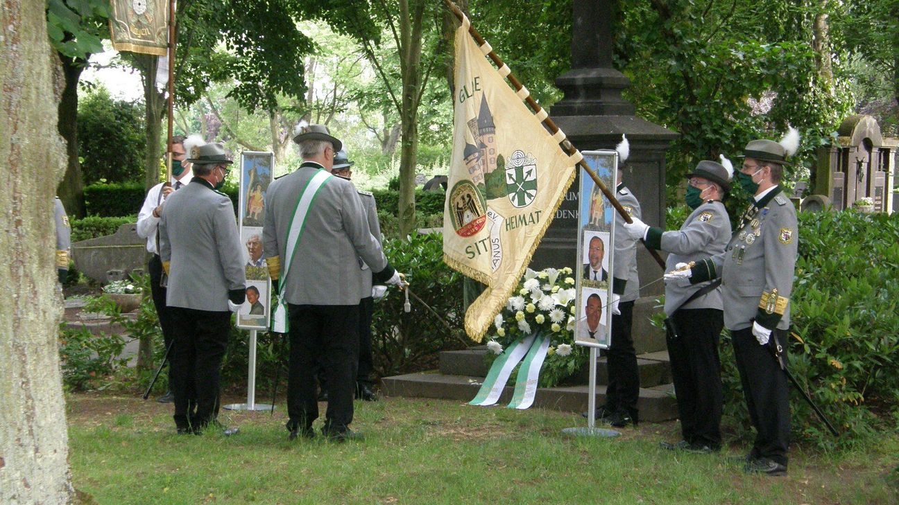 Auch wenn das Schützenfest dieses Jahr ausfiel, war es den Vereinsmitgliedern doch ein Bedürfnis, gemeinsam insbesondere deren zu gedenken, die in den vergangenen Wochen verstorben sind und die man auf Grund der Pandemie-Bestimmungen nicht zum Grabe geleiten konnte. „Ich bete an die Macht der Liebe“. Mit der Melodie von Dmitri Stepanowitsch Bortnjanski wurden die Mitglieder der Schützengesellschaft Mayen auf dem Friedhof zum Totengebet empfangen. Zuvor hatten sie gemeinsam die Heilige Messe in der St. Veit Kirche gefeiert. Pater Justin, der den Gottesdienst zelebrierte, ging dabei besonders auf das soziale Engagement der Schützenbruderschaft und deren Bekenntnis zur Kirche ein. Er wünschte den Schützen eine gute Gemeinschaft, auch wenn in diesem Jahr kein Schützenfest gefeiert werden kann. Diesen Gedanken nahm auch Brudermeister Jürgen Kreusch in seiner Begrüßung auf dem Friedhof auf. Das Gedenken an die in den vergangenen Wochen verstorbenen Mitglieder stand im Mittelpunkt der Gedenkfeier. Brudermeister Jürgen Kreusch erinnerte an die verstorbenen Mitglieder: Dieter Braun, Heinz Wirtz, Karl Meurer und Norbert Lellig und würdigte deren Verdienste um die Schützengesellschaft. „Ihnen allen möchten wir heute Dank sagen für ihre Treue zum Verein, für alles, was sie für uns geleistet haben und für die schöne, gemeinsam verbrachte Zeit. Wir werden Ihnen stets ein ehrendes Gedenken bewahren. Pater Justin leitete das gemeinsame Gebet ein und mit den Fürbitten baten Marvin Nöthen und Kai Kreusch für die gefallenen und verstorbenen Schützenschwestern, Schützenbrüder, Familienangehörigen und Freunde und für die Schützengesellschaft. Im Anschluss nahmen die Schützen Aufstellung zur Kranzniederlegung. Mit dem Trompetensolo „Ich hatt` einen Kameraden“ endete die feierliche Totenehrung.