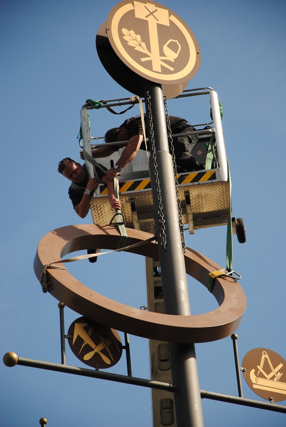 Die Mayener Hämmerzunft, ein Zusammenschluss von in Mayen ansässigen Handwerkern und Handwerksbetrieben, war es, die den Zunftbaum 2001 initiiert und aufgestellt hatte. Auch die Pflege und Renovierung wird seither durch ehrenamtliche Helfer der Hämmerzunft gewährleistet. Jetzt haben Mitglieder der Hämmerzunft dafür gesorgt, dass ein neuer Kranz - diesesmal aus Stahl - angefertigt werden konnte, damit der Zunftbaum wieder in altem Glanz erstrahlen kann. Auch Bürgermeister Rolf Schumacher war beeindruckt, wie die beteiligten Akteure, den Kranz justierten und nach und nach mit Ketten befestigten. Er bedankte sich bei allen Beteiligten der Aktion vor Ort. "Der Zunftbaum vor dem Neuen Rathaus in Mayen ist inzwischen sowohl für Touristen, als auch für die Bürger eine Mayener Sehenswürdigkeit geworden. Umso mehr ist das ehrenamtliche Engagement der Mayener Hämmerzunft für den Zunftbaum zu bewerten", so Bürgermeister Schumacher. Foto: Stadt Mayen www.mayenzeit.de