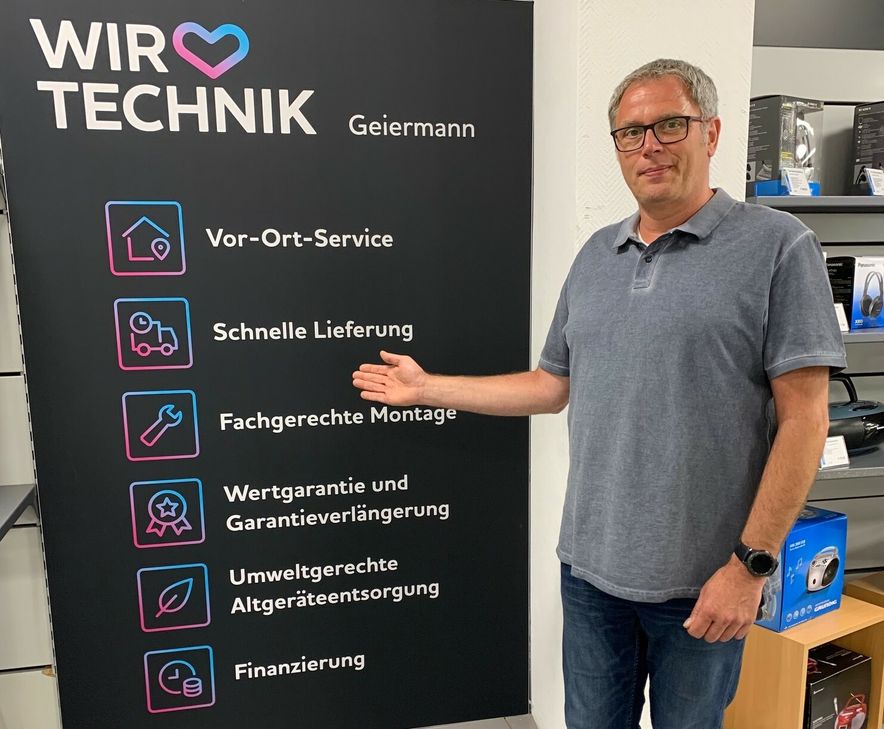 Am 13. Juni können sich Kunden ein eigenes Bild vom neuen Wir lieben Technik Geiermann machen, dann eröffnet das Fachgeschäft offiziell. Geplant war eine Eröffnungsfeier mit Häppchen und Sekt, doch aufgrund der Hygienevorschriften muss darauf leider verzichtet werden. Dennoch lohnt sich ein Besuch – für die Wiedereröffnung gibt es besondere Angebote. „Da ist für jeden etwas dabei und das zu wirklich günstigen Preisen“, betont Markus Kahler und scherzt: "Wir versprechen, alle Besucher mit einem Lächeln zu begrüßen, auch wenn man das durch die Maskenpflicht nicht sofort erkennt.“ Auch wer später kommt, steht dank der neuen kundenfreundlichen Öffnungszeiten nicht vor verschlossenen Türen. Diese sind von Montag bis Freitag von 9.30 Uhr bis 18.30 Uhr und samstags bis 14 Uhr.
