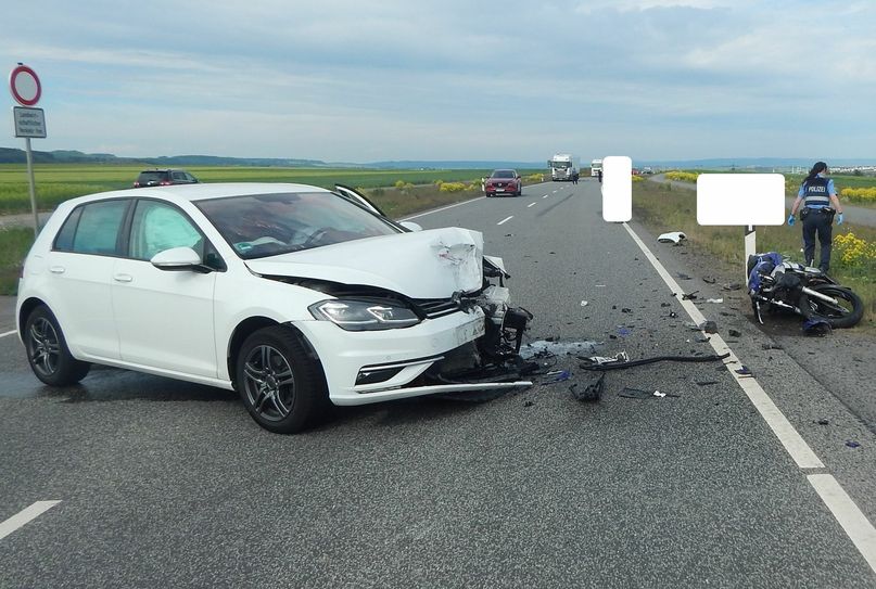 Eine Pkw-Fahrerin übersah, laut Polizeibericht, das entgegenkommende Motorrad und wollte nach links auf einen Wirtschaftsweg abbiegen. Der Motorradfahrer konnte eine Kollision nicht mehr vermeiden und wurde nach medizinischer Erstversorgung in ein Krankenhaus eingeliefert. Die B 256 war während der Verkehrsunfallaufnahme für rund zwei Stunden voll gesperrt. Foto: Polizei