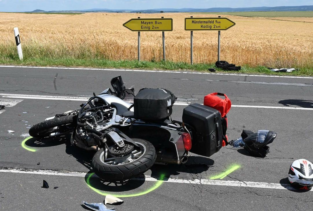 Nach ersten Ermittlungen der Polizei hat ein Pkw-Fahrer vermutlich die Vorfahrt missachtet und sein Auto ist mit dem Motorrad kollidiert.  Durch den Zusammenstoß wurden der Motorradfahrer und seine Sozia schwer verletzt. Sie mussten vom Rettungsdienst in umliegende Krankenhäuser gebracht werden. Die Insassen des Pkw blieben unverletzt. Im Einsatz waren der Rettungsdienst, der Rettungshubschrauber, die Freiwilligen Feuerwehren Gering und Polch sowie Beamte der Polizeiinspektion Mayen.  Foto: Walz