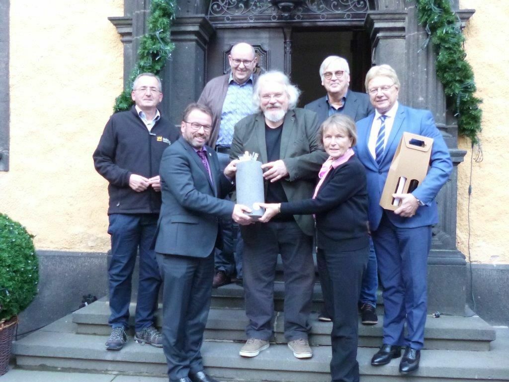 In Mülheim a.d. Ruhr geboren und zur Schule gegangen, studierte er in Bonn Vor- und Frühgeschichte und Ägyptologie; seine berufliche Laufbahn begann er im Landesmuseum Bonn und dem Stadtmuseum in Andernach. Im August 1993 wurde Dr. Oesterwind als Mayener Museumsleiter und Burgverwalter eingestellt. Viel hat sich seither getan: Aus dem ehemaligen „Eifeler Landschaftsmuseum“ entstand im Laufe der Jahre das heutige moderne Eifelmuseum, das „Deutsche Schieferbergwerk“ im Felsen unter der Genovevaburg und schließlich auch die Vulkanparkstation „Terra Vulcania“ mit der Museumshalle „SteinZeiten“, in der die 7.000 jährige Geschichte der Mayener Basaltlavabrüche erzählt wird. Diese bewegte Zeit neigt sich nun dem Ende zu, denn im März kommenden Jahres wird Dr. Oesterwind das Rentenalter erreichen, um dann in seine „zweite Heimat“ Frankreich zu wechseln. Anlässlich der Sitzung des Kuratoriums für das Eifelmuseum wurde der scheidende Museumsdirektor von den Mitgliedern des Kuratoriums herzlich verabschiedet. Oberbürgermeister Wolfgang Treis und Mathilde Weinandy, Präsidentin des Eifelvereins, dankten dem zukünftigen Ruheständler für die langjährige, fruchtbare und angenehme Zusammenarbeit. Als Abschiedsgeschenk wurde von Oberbürgermeister Treis unter anderem ein Flaschenkühler aus der heimischen Basaltlava nebst Inhalt als Geschenk überreicht, das Dr. Bernd Oesterwind an seine Mayener Zeit erinnern soll. Dieser sagte in seinen Dankesworten, dass Mayen als wichtige Lebensstation auch in Zukunft ganz gewiss nicht vergessen werde und der Kontakt - wenn nun auch sporadischer- aufrechterhalten werde. Foto: Stadt Mayen