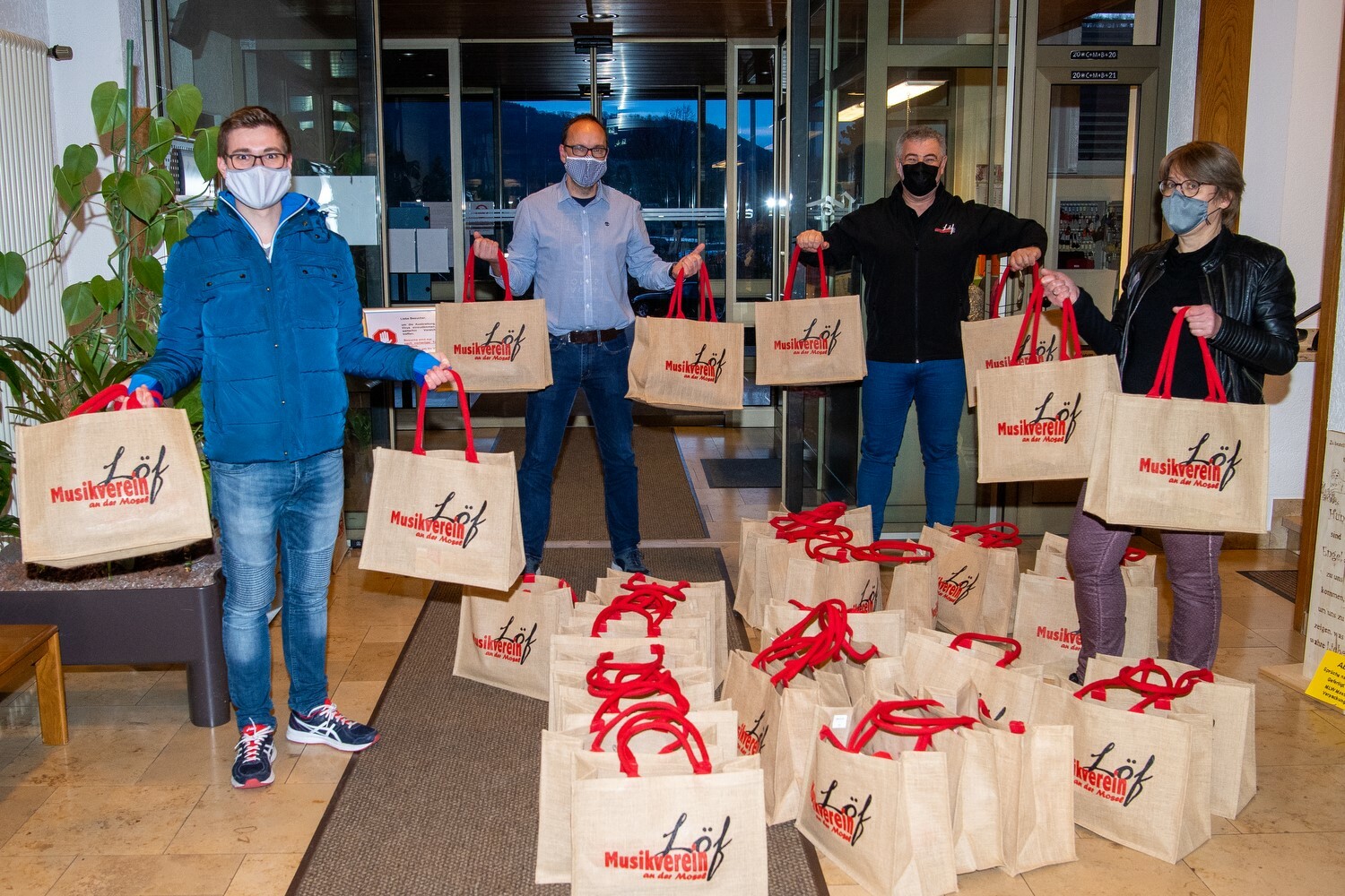 Nach inklusiven Benefizkonzerten und einem musikalischen Weihnachtsgruß gab es jetzt "Mutmach-Pakete" für die Bewohnerinnen und Bewohner, die von Vorstandsmitglied Michi Schunk und vom Vorsitzenden Wolfgang Weber überbracht wurden. "Da sind allerlei nützliche Dinge für den Alltag drin, aber vor allem auch die Botschaft, dass der Musikverein Löf weiter an der Seite der Menschen im Herz-Jesu-Haus sein wird", sagt Weber. "Es ist auch ein überragendes Beispiel dafür, wie unsere Vereine in der Coronakrise über ihren Tellerrand hinausschauen und für andere da sein wollen", stellte der Löfer Ortsbürgermeister Johannes Liesenfeld bei der Übergabe an Claudia Schönershoven vom Herz-Jesu-Haus fest. Foto: Seydel www.musikverein-loef.de