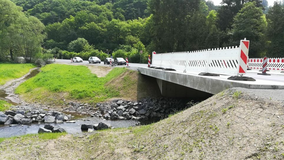 In die Baumaßnahme waren auch die Erneuerung der Strecke zwischen der Einmündung der L 97 in Richtung Weiler und der Augstmühle sowie die Umverlegung des Bachlaufes in sein ursprüngliches Bachbett als landespflegerische Maßnahme eingebunden. Die Bauarbeiten wurden, so der Landesbetrieb Mobilität (LBM) Cochem-Koblenz, so ausgeführt, dass der Verkehr so lange wie möglich über die alte Brücke geführt wurde und eine Vollsperrung erst dann eingerichtet wurde, als die Arbeiten keine andere Verkehrsführung mehr zugelassen haben. Die separat vergebene Montage von Schutzplanken, Leitpfosten sowie Schutzgeländern an der Brücke sowie die Beschilderung konnten, so der LBM, nicht unmittelbar an die Fertigstellung von Brückenbau und Straßenbau anschließen. Um hier eine Sperrung des Abschnittes und eine damit einhergehende Umfahrung zu vermeiden, sei eine provisorische Verkehrsführung mit Ampelbetrieb und entsprechender Geschwindigkeitsreduzierung eingerichtet worden, die es ermöglicht, diesen Abschnitt zu befahren. Die noch ausstehenden Arbeiten sollen bis Mitte Juli abgeschlossen sein. Die Kosten für die Baumaßnahme belaufen sich auf 1,3 Millionen Euro und lägen damit, bilanziert der LBM, in dem ursprünglich vorgesehenen Kostenrahmen. Die gesamten Kosten werden durch das Land Rhein-land-Pfalz getragen. Als weitere Maßnahme stehe nun die Instandsetzung der L 97 zwischen der Einmündung L 96 und der Ortsgemeinde Weiler an. Die erforderlichen Rodungen in diesem Abschnitt wurden bereits vorgenommen; die Umsetzung der Straßenbaumaßnahme sollen in Kürze beginnen. Foto: LBM www.lbm.rlp.de