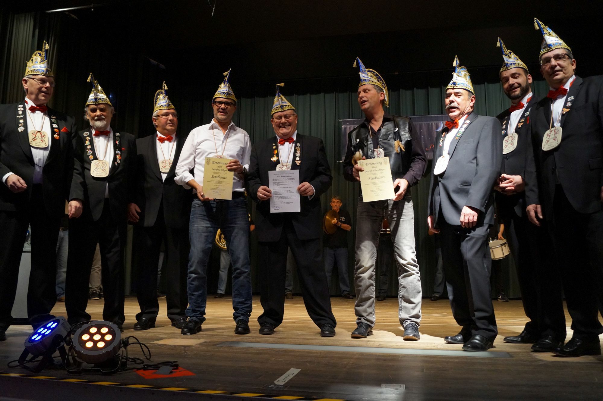 Viele Ehrenleute aus Polch und Umgebung waren der Einladung der gestandenen »Studiosen« gefolgt, die im ausgebuchten Polcher Forum zur Ernennung ihrer neuen Mitglieder geladen hatten. Aufgenommen in den elitären Kreis der »Akademie« Polch wurden in diesem Jahr die beiden Ortsansässigen Martin Eisenbürger und Manfred Höger. Eigens zu dem feierlichen Anlass angereist waren, neben Karnevalisten aus der Region, Verbandsbürgermeister Maximilian Mumm, der Polcher Stadtchef Gerd Klasen, die Beigeordneten Claudia Blotzki und Fred Strässer sowie, in Vertretung des Landkreises Mayen-Koblenz, der Beigeordnete Rolf Schäfer. Die festliche Ansprache sowie die eigentliche Ernennung von Eisenbürger und Höger übernahm »Studiosen-Kanzler« Willi Wagner, während die Kameraden auf der Bühne Spalier standen. Anschließend mussten die beiden Frischernannten sogleich unter Beweis stellen, was sie karnevalistisch zu bieten hatten. Martin Eisenbürger, dem es nach seiner Ernennung zunächst einmal die Sprache verschlug, konnte sich der vollen Sympathie des Publikums erfreuen: Nach einem kräftigen Applaus lief er, ebenso wie sein Kamerad Manfred Höger, zur Höchstform auf. Das Programm des Abends war gewohnt bunt und vielfältig - Einzeldarbietungen, Tanz und Gesang wechselten sich ab. Highlights der diesjährigen Veranstaltung waren ohne Frage die Aufführung des Märchens »Rotkäppchen« nach Interpretation der »Studiosen« sowie der berühmte Abschlusstanz aus dem Film »Dirty Dancing«, der sich in einem Punkt gravierend vom Original unterschied: Die Angebetete des Hauptdarstellers und Frauenschwarms »Johnny« sprang nicht diesem in die Arme, sondern steuerte zielstrebig auf die attraktiven Mittänzer zu und ließ den schönen »Johnny«, der sie auf Knien und mit ausgebreiteten Armen voller Sehnsucht erwartete, in die Röhre schauen. Durch den Abend führte Studiosen – Chef Willi Wagner, der allen Grund hatte, stolz auf seine Truppe zu sein. Fotos: Ott