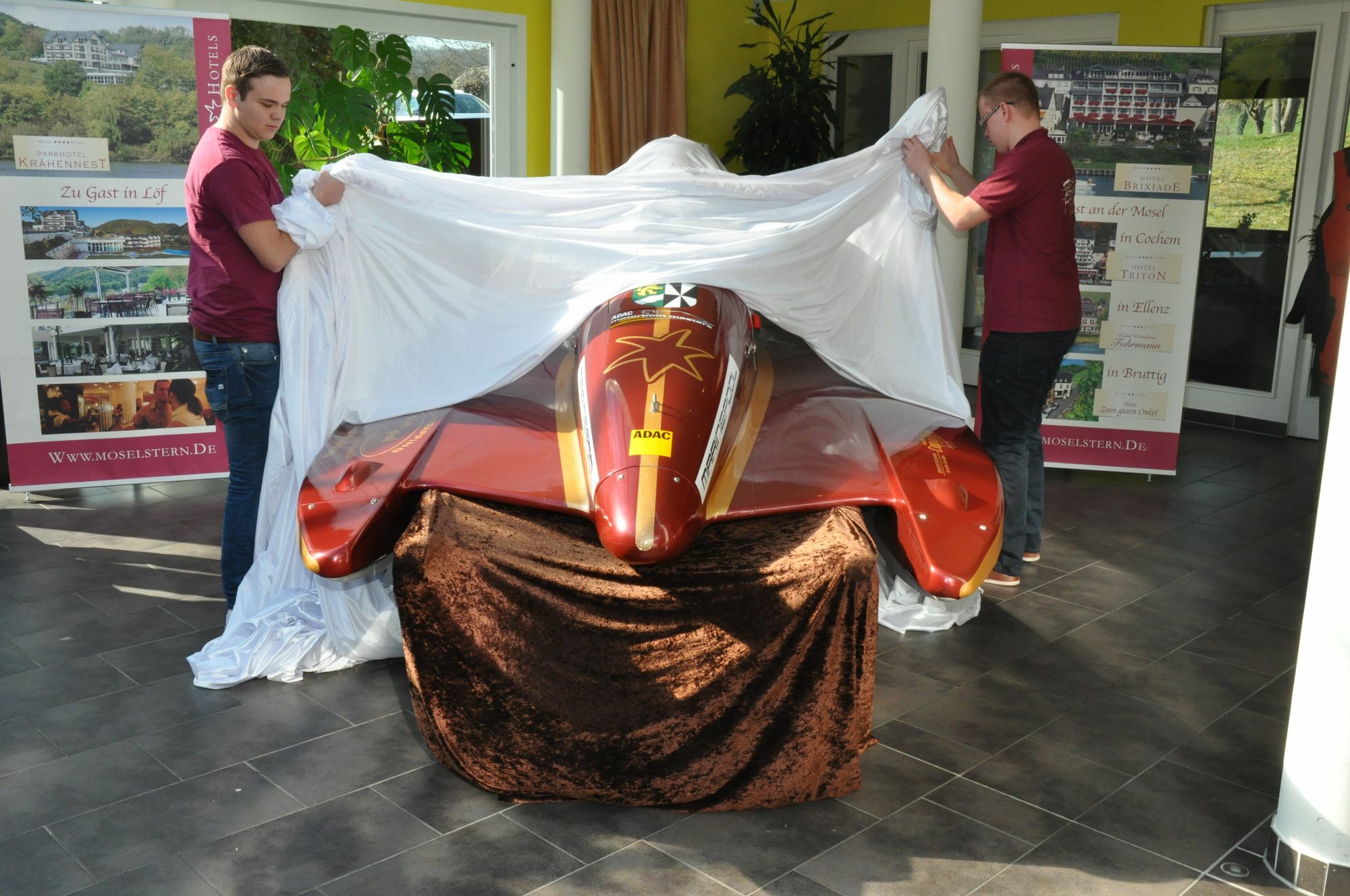 Die Sonne strahlte in den Wintergarten des Hotels Krähennest als das neue Boot des Löfer Teams enthüllt wurde. Wie bestellt, denn Team-Manager Thomas Groß ist ein echter Coup gelungen. Er hat das Boot des mehrmaligen Champions Mike Szymura an Land gezogen. Finanziell war der Kauf machbar, denn das Team hat seine Mittel bisher nicht aus dem Fenster geworfen und ist eher durch seine Leidenschaft, den Zusammenhalt und Zuverlässigkeit in Erscheinung getreten. "Wir sind stolz ein solches Boot zu haben", fasste Thomas Groß seine Gefühlswelt in einem Satz zusammen. Sein Sohn Christian, der erst seit zwei Jahren in einem Motorboot sitzt, soll mit dem neuen Flitzer endlich wettbewerbsfähiger sein. Dafür muss er die 60 PS optimal aufs Wasser bringen und mit Höchstgeschwindigkeiten bis 140 km/h die Konkurrenz in Schach halten. "In der Serie sind mehr Boote am Start, also kann ich auch mehr überholen", flachst der Pilot, der weiß, dass er in der neuen Klasse auch nichts geschenkt bekommt. Die Experten schätzen die Rennen als "enger und härter" ein, aber mit Angst dürfe man eh‘ nicht an den Start gehen, so Christian Groß. Und das ist zum Auftakt der Rennsaison am 21. und 22. Mai in Brodenbach der Fall. "Das ist doch Weltklasse mit dem Heimrennen zu starten und dann hauen wir einen raus", gibt sich der Lokalmatador äußerst optimistisch. Informationen zum Team: www.moselstern-racing.de Fotos: Pauly