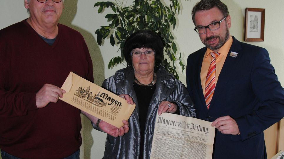 Die Mayener Zeitung war eine der beiden großen Tageszeitungen in Mayen. Sie erschien im Verlag Louis Schreder, der auch den Druck besorgte. Man zählte bereits den 61. Jahrgang und bezeichnete sich selbst als die "gelesenste Zeitung im Kreise Mayen". Neben Nachrichten aus aller Welt waren es aber vor allem die lokalen und regionalen Nachrichten, die das Blatt für einen Leserkreis interessant machten. Zudem war es als "Amtliches Kreisblatt für den Kreis Mayen" das Bekanntmachungsorgan des Landratsamtes. Die lokale Ausrichtung war auch der Grund, dass die örtliche Wirtschaft, vor allem der Einzelhandel täglich in der Zeitung inserierte. Im Eifelarchiv setzt die Überlieferung an Tageszeitungen erst spät und zwar mit dem Jahr 1918 ein. Das frühe Kapitel der lokalen Tageszeitungen fehlt hier leider völlig. Umso willkommener sind Schenkungen, auch wenn es Einzelstücke sind. Beim zweiten Stück von Rosemarie Arenz handelt es sich um einen Briefumschlag im Längsformat der Stadtverwaltung aus den 30er Jahren des letzten Jahrhunderts. Es trägt die Aufschrift "Der Bürgermeister der Stadt Mayen" sowie "Stadt Mayen: Kreishauptstadt". Bei näherem Hinschauen entpuppt sich das Couvert aber auch als Werbemittel der damals aufkommenden Fremdenverkehrswirtschaft. Auf der Rückseite ist eine stilisierte Silhouette der Stadt abgebildet. Daneben steht der damals neue Werbeslogan: Stadt der Burgen und Türme (…). Der Schriftzug Mayen ist kaligrafisch gestaltet und war Teil eines frühen Corporate Design. Silhouette, Slogan und Name waren jene Elemente, die damals zahlreich auf den verschiedensten Druckmedien Verwendung fanden und für Mayen werben sollte. Oberbürgermeister Treis und Hans Schüller, Vorsitzender des Geschichts- und Altertumsvereins Mayen, zeigten sich erfreut über die Neuzugänge. "Sie stellen eine wertvolle Ergänzung unserer Bestände dar", so OB Treis. Foto: Jasmin Franz / Stadt Mayen www.mayenzeit.de