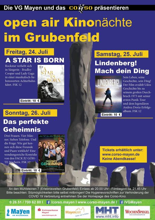Die Veranstaltung findet erstmals an drei Abenden, im Zeitraum 24. bis 26. Juli, satt, an denen tolle Filme unter freiem Himmel präsentiert werden. Am Freitagabend starten die Kinonächte mit dem Film „A Star Is Born“ mit Bradley Cooper und Lady Gaga in den Hauptrollen. Samstags geht es weiter mit dem Film „Lindenberg! Mach dein Ding“, welcher die Geschichte Udo Lindenbergs erzählt. Abschließend wird Sonntags „Das perfekte Geheimnis“, eine Komödie von den "Fack Ju Göhte"-Machern, gezeigt. Kinofreunde sollten sich Decken, Kissen, Campingstühle oder andere Sitz-/Liegemöglichkeiten sowie eine Taschenlampe für den Rückweg mitbringen. Für das leibliche Wohl der Kino-Besucher ist gesorgt: Getränke, Popcorn und erstmals die beliebten Nachos sind vor Ort zu erwerben. Einlass zu den Filmvorführungen im Grubenfeld in Mayen, An den Mühlsteinen 7 (Erlebniswelten Grubenfeld), ist um 20 Uhr. Der Film beginnt jeweils um ca. 21.45 Uhr – bei ausreichender Dunkelheit. Eintritt: 10 Euro pro Person und Film. Aus Gründen der aktuellen Corona Lage sind die Tickets ausschließlich online zu erwerben. In diesem Jahr wird es keine Abendkasse geben! Bitte beachten Sie unser Hygienekonzept und halten sich an die für die Veranstaltung geltenden Hygieneregeln. Tickets, Hygienekonzept und –regeln erhalten Sie unter www.corso-mayen.de Kinder und Jugendliche unter 16 Jahren dürfen aufgrund der späten Uhrzeit die Veranstaltung nicht ohne Begleitung eines Erziehungsbeauftragten besuchen.