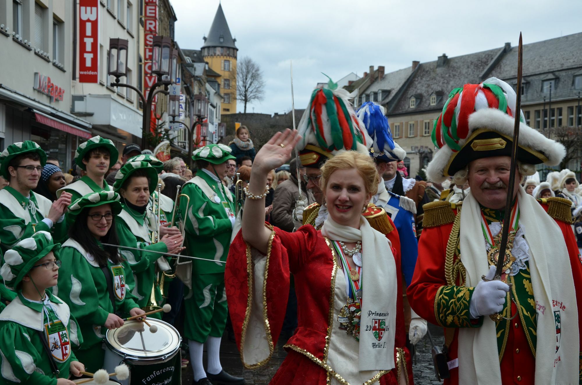 Unter dem Sessionsmotto »Mir han os Herz am richtije Fleck, mir fairen Faasenaacht be jeck!« möchte Prinzessin Heike I. die Narren in Mayen einen. Sie ist die erste alleinherrschende Prinzessin während des 123-jährigen Bestehens der Mayener Karnevalsgesellschaft »Alte Große«. Ihr zur Seite stehen ihre Pagen Kathrin und Jenny sowie ihr Hofnarr Thorsten und ihr Mundschenk Stefan. Seinen Anfang fand der erste Sonntag des Jahres mit der Verleihung des städtischen Verdienstordens. Dieser wurde durch Oberbürgermeister Treis an den »Alte Große«-Präsident Christoph Schwab und an Anja Steffens verliehen. Nach dieser Feierlichkeit stand der große Proklamationsumzug durch die Mayener Innenstadt an. Es beteiligten sich der »Fanfarenzug Grün-Weiß« Mayen, der »Banausenzug Grün-Weiss« Kürrenberg, der Spielmannszug sowie der Musikzug der Feuerwehr Mayen. Vom Brückentor aus zogen die Karnevalisten zum Alten Rathaus am Marktplatz, um dort ihre Tollität abzuholen und zu ihrer Proklamation ins Rathaus Rosengasse zu bringen. Neben eingesessenen Mayener Narren fanden sich auch viele Gäste aus umliegenden Ortschaften und den Stadtteilen auf dem Marktplatz zum Generalappell ein, um einen Blick auf die angehende Karnevalshoheit zu erhaschen. Im Rathaus Rosengasse hatte Oberbürgermeister Treis die Ehre, Prinzessin Heike I. offiziell in ihr Amt zu erheben. Die Weichen für den Ansturm auf das Alte Rathaus an Weiberfastnacht wurden bereits gestellt, Oberbürgermeister Treis kündigte aber an, es der Prinzessin nicht so leicht machen zu wollen. Während der offiziellen Ordensübergabe gingen aber sowohl der Oberbürgermeister als auch der Präsident der »Alten Großen« vor der Tollität »in die Knie«. Prinzessin Heike I. kommentierte das mit: »Die beiden liegen mir eben zu Füßen!« Fotos: Seydel/von der Heiden