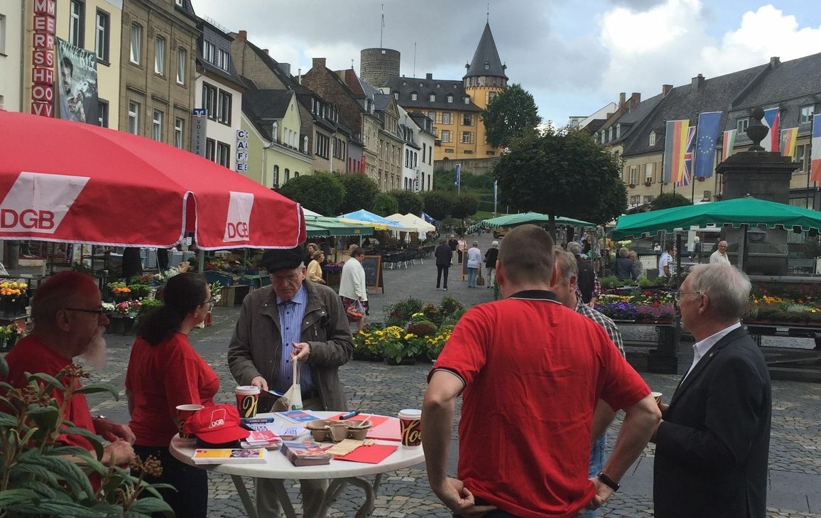 Unter anderem verteilten die Gewerkschafterinnen und Gewerkschafter Informationsmaterial zu den geplanten "Freihandelsabkommen". Auf großen roten Karten konnten Interessierte ihre eigene Meinung schreiben. Die Karten wurden dann vor dem Rathaus präsentiert. Karin Fahrenholz-Krämer, die Vorsitzende des DGB Kreisverbands Koblenz-Mayen, erklärte: "Ich halte CETA und TTIP für brandgefährlich, weil nur wirtschaftliches im Vordergrund steht. Soziales und der Verbraucherschutz kommen unter die Räder!" Mit dem Infostand wollte der Kreisverband auch auf den bundesweiten Aktionstag am 17. September aufmerksam machen. Dann finden in mehreren Städten Demonstrationen statt. Aus der Region fährt ein Bus mit Gewerkschaftsmitgliedern zur Demonstration nach Frankfurt. Foto: DGB www.koblenz.dgb.de