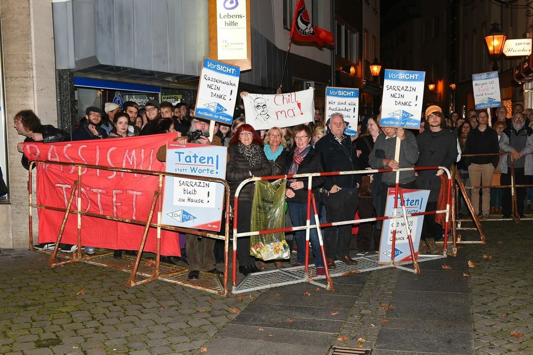Sein "Auftritt" war begleitet von Protestaktionen in unmittelbarer Nähe der Buchhandlung. Mit Plakaten und Bannern machten die Demonstranten ihrem Unmut Luft. Weitestgehend davon unberührt bliebt die angekündigte Lesung, die eher eine Darstellung seiner Sicht zur Einwanderungsproblematik war. Dabei unterschied er deutlich Asylanten, Migranten, Flüchtlinge und Einwanderer, die mehr oder minder berechtigt nach Europa und Deutschland einreisen. Sein "spontaner" Vortrag wurde von Seiten des Publikum teilweise mit Szenenapplaus begleitet. Nach seinen Ausführungen beantwortete er bereitwillig Fragen aus dem Publikum. Die Protestaktionen (nach Polizeiangaben waren es rund 200 beteiligte Personen) außerhalb fanden bereits während der Veranstaltung ein Ende. Buchhändlerin Beate Härig ist erleichtert, dass nichts passiert ist, denn "das Wohl ihrer Kunden lag mir sehr am Herzen". Eine besonderen Dank richtet sie auch an die Demonstranten, die sich an die vorher getroffenen Absprachen gehalten hatten, und natürlich an die Ordnungskräfte. "Dass es so ein Aufwand war, tut mir unendlich leid", so Härig, die trotzdem froh ist, die Veranstaltung durchgezogen zu haben. Fotos: Seydel