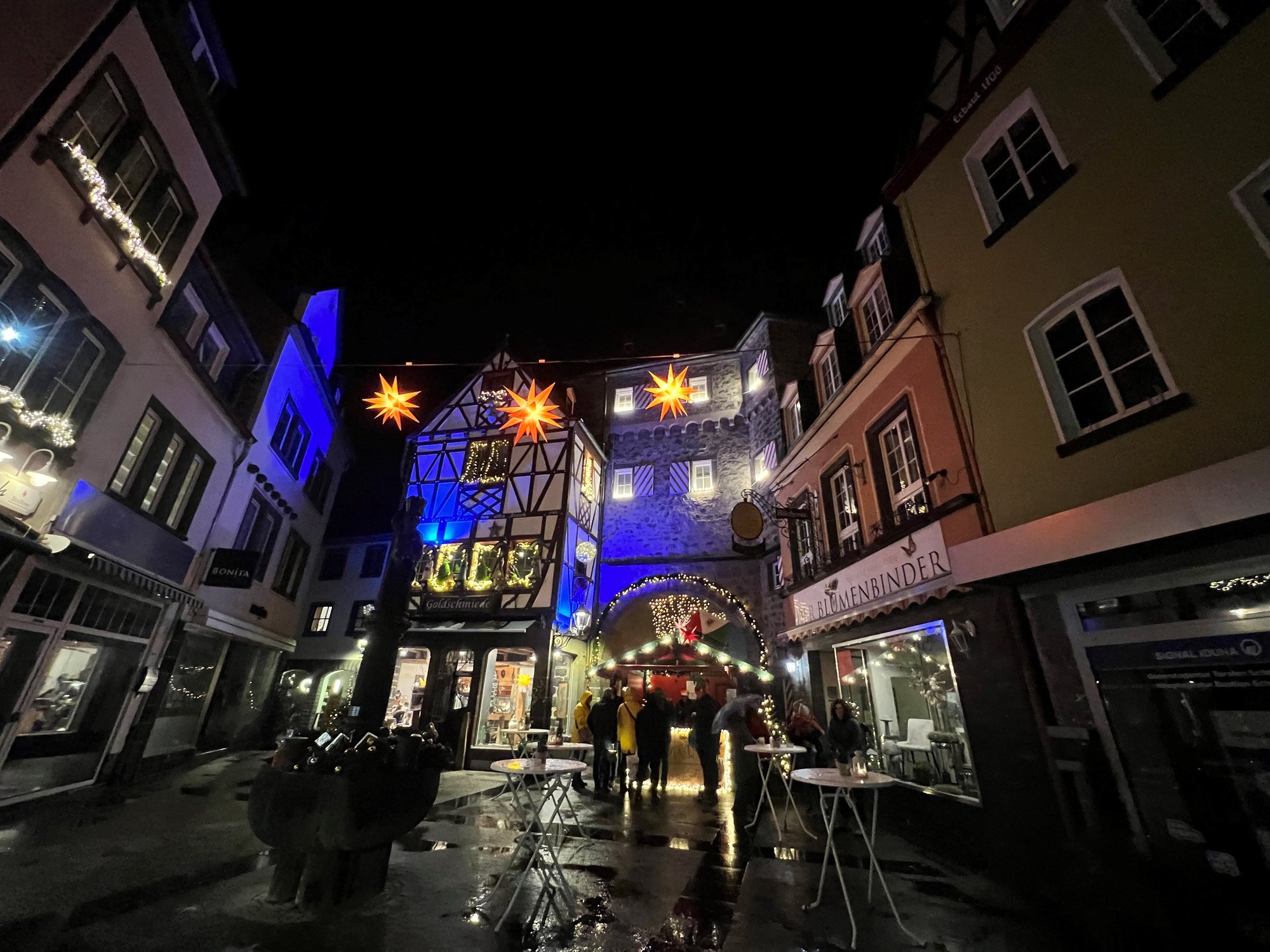 Der Mayener Weihnachtsmarkt bietet den perfekten Blick auf die Genovevaburg mit dem Goloturm.