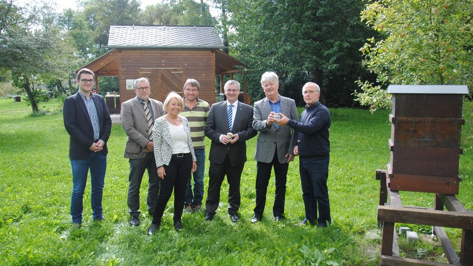 Der Blütenhonig, der in Mayen geerntet, geschleudert und abgefüllt wurde, ist mit einem passenden Etikett versehen und wirbt mit dem Spruch "So bunt, dass es summt". Auf dem Deckel befindet sich außerdem ein QR-Code, den man mit dem Smartphone scannen kann. Sodann erhält man die genaue Honiganalyse, erfährt also den Standort der Bienenvölker sowie das Ernte- und Abfülldatum und kann sich alle Angaben des Prüfberichtes zu Gemüte führen. So gibt es keinen Zweifel daran, dass man ein echtes Mayener Qualitätsprodukt erworben hat. Bei einem Besuch des Dienstleistungszentrum Ländlicher Raum Westerwald-Osteifel überreichte (von rechts) Dr. Christoph Otten Mayens Bürgermeister Rolf Schumacher und Landrat Dr. Alexander Saftig die ersten Gläser des Mayener Honigs. Mit dabei waren auch der städtische Gärtnermeister Wolfgang Seul, Hannelore Knabe (Mitglied des Arbeitskreises "Bienenfreundliche Stadt"), Johannes Noll, Leiter des Dienstleistungszentrums Ländlicher Raum Westerwald-Osteifel Johannes Noll, und Dennis Falterbaum (Mitglied des Arbeitskreises "Bienenfreundliche Stadt"). Foto: Jasmin Franz/Stadt Mayen www.mayenzeit.de