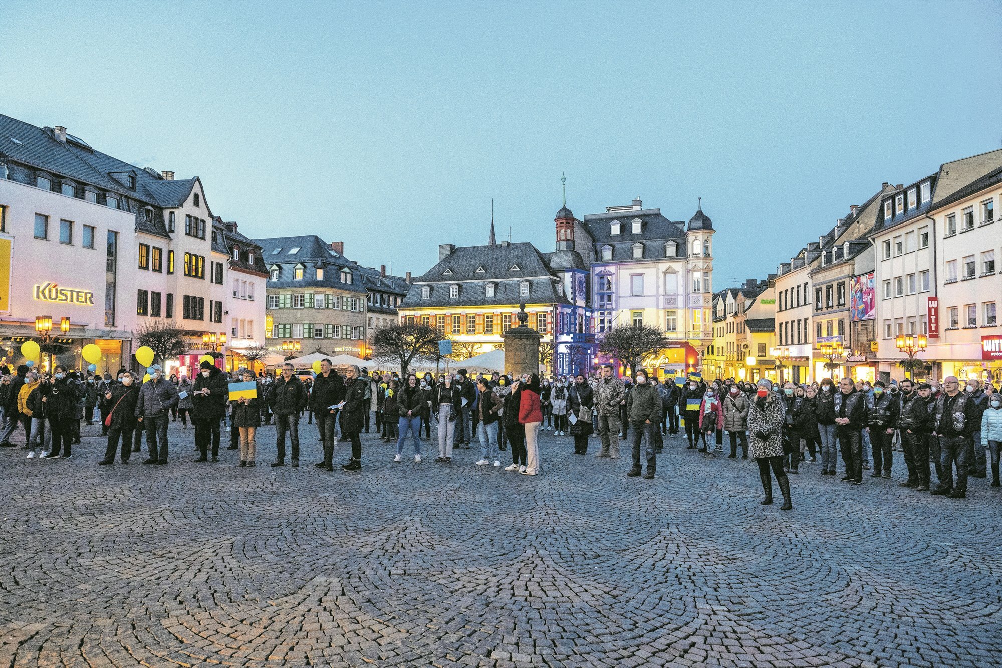 Die Mayener Stadtspitze und die Ratsfraktionen hatten am Mittwochabend zu einer gemeinsamen Solidaritätsveranstaltung auf den Mayener Marktplatz eingeladen. "Uns alle beschäftigt die dramatische Situation in der Ukraine. Mit Sorge verfolgen wir die Entwicklungen und wollen daher auch gemeinsam ein Zeichen der Solidarität setzen", erklärt Oberbürgermeister Dirk Meid im Vorfeld und rief die Mayener Bürgerinnen und Bürger zur regen Teilnahme an der Veranstaltung auf. Rund 500 Personen waren dem Aufruf gefolgt. Überall waren blau-gelbe Flaggen, Wimpel und teils auch Kleidung in den Nationalfarben zu sehen. Auch das Alte Rathaus war in blaues und gelbes Licht gehüllt. Damit machte die Mayener Bevölkerung sichtbar: Wir zeigen ein deutliches Zeichen zur Solidarität mit der Ukraine.