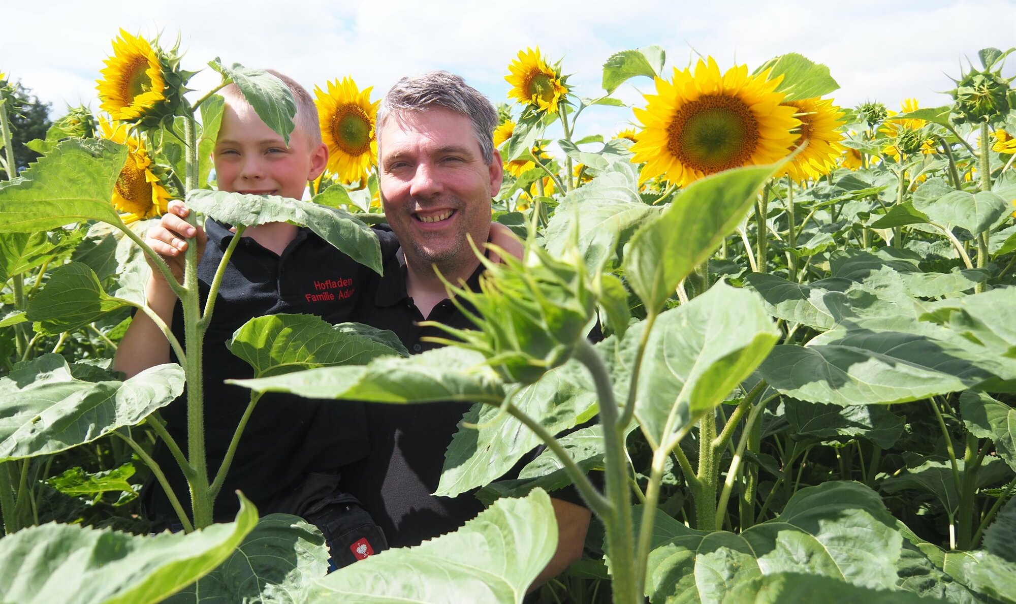 Wer in den vergangenen Monaten Sonnenblumenöl kaufen wollte, sah sich in den Supermärkten leeren Regalen, rationierter Ware und dann mit deutlich gestiegenen Preisen konfrontiert. Mit diesen industriell raffinierten Ölen will Gregor Adams aber nicht konkurrieren. »Wir haben uns im Herbst vergangenen Jahres entschieden auf einer Fläche von 22 Hektar Sonnenblumen statt Kartoffeln für die Industrie anzubauen. Die Pflanze wurzelt tief und braucht dementsprechend wenig Stickstoffgaben. Das ist auch ökonomisch interessant«, erzählt der Landwirt, der zusammen mit seiner Familie und der seines Bruders Jürgen einen Hofladen betreibt und dort unter anderem Spargel, Kartoffeln, Zwiebeln, Kürbisse und Möhren aus eigenem Anbau vertreibt. Im Spätherbst soll jetzt kaltgepresstes Sonnenblumenöl hinzukommen. Von Mitte September bis Mitte Oktober steht die Ernte an. Danach müssen die Sonnenblumenkerne rund einen Monat trocknen und nachreifen, ehe sie in einer eigenen Ölmühle verarbeitet werden können, erklärt der Landwirtschaftsmeister. »Flaschen und Etikettierung haben wir schon«, lacht Adams. Und Erfahrungen mit Sonnenblumen hat die Familie auch schon: »In den 1980er Jahren haben meine Eltern schon einmal Sonnenblumen angebaut. Die Nachfrage war nicht groß und so haben wir damals die Kerne auf Vogelschauen verkauft«, schmunzelt er. Und Vogelfutter ist auch heute ein gutes Stichwort, denn der anfallende Ölkuchen wird von einem Maifelder Tierfutterbetrieb genutzt werden.
