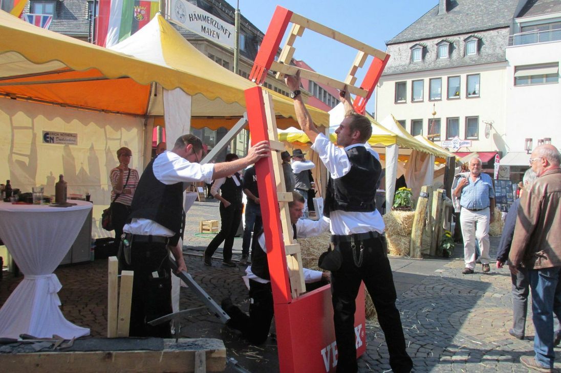 Los geht es bereits eine Woche vor dem traditionellen Stein- und Burgfest im Festzelt am 1. September mit „Sidewalk“. Am Samstagabend steht dann eine „Mallorca-Party“ auf dem Programm. Der Dienstag, 5. September, steht ganz im Zeichen der älteren Mitbürgerinnen und Mitbürger, die nach der erfolgreichen Durchführung im Rahmen des Stadtjubiläums 2016 nun wieder ihren Seniorentag im Festzelt feiern. Montag und Mittwoch ist Ruhetag im Festzelt. Donnerstags startet dann das traditionelle Programm des Stein- und Burgfestes im beliebten Festzelt auf dem Marktplatz mit der alljährlichen Sportlerehrung und am Freitag, 8. September, spielt dort ab 20 Uhr die Old-Star-Band mit Live-Musik. Am Samstagabend wartet dann „Just Dexter“ im Festzelt auf die Musikfreunde. Am Samstag und Sonntag, 9. und 10. September, bietet der Handwerker- und Bauernmarkt auf der Genovevaburg und in den Burggärten Neues und Altbewährtes. Auf dem Marktplatz präsentieren sich dabei die Mayener Zünfte und Betriebe mit ihrem „Handwerk zum Anfassen“. Daneben hat man sich für das Heimatfest noch ein paar besondere Aktionen einfallen lassen. An beiden Tagen gibt es von 11 – 18 Uhr noch ein besonderes Highlight: „Die Schatzsuche im Zunftkasten:“ Auch sportliche Aspekte kommen nicht zu kurz: Es werden Boule in den Burggärten (Samstag und Sonntag, von 10 – 17 Uhr), Sportvorführungen vom Fit Up am Samstag von 12 bis 12.20 Uhr auf dem Marktplatz oder das Bürgerschießen der Mayener Bogenschützen (Samstag und Sonntag von 11 – 18 Uhr in den Burggärten) angeboten. Der Sonntag steht ganz im Zeichen der Tradition. Nach einem Festumzug findet ab 11.30 Uhr im Festzelt der beliebte Frühschoppen statt, welcher mit einem Fassanstich eröffnet wird. Beim verkaufsoffenen Sonntag von 13 bis 18 Uhr kann man am 10. September dann den Besuch des Heimatfestes auch noch mit einem Einkaufsbummel verbinden. Auch die Mayener Museen beteiligen sich am Stein- und Burgfest: Das Eifelmuseum sowie das Deutsche Schieferbergwerk haben am Wochenende von 10 bis 18 Uhr geöffnet, Terra Vulcania von 10 bis 17 Uhr. www.mayen.de Foto: Archiv