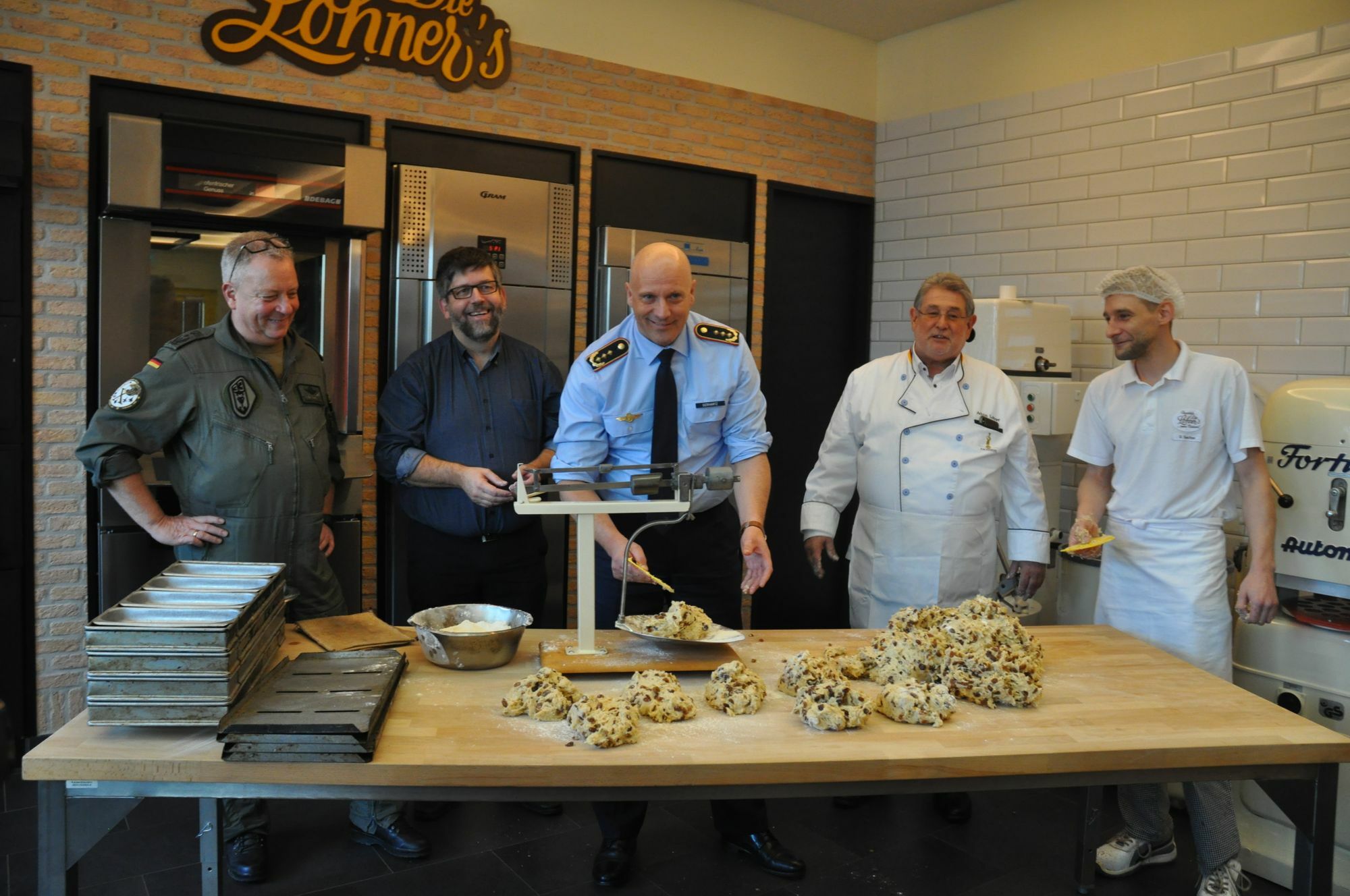 Das war kein alltäglicher Einsatz für den Inspekteur der Luftwaffe: Generalleutnant Ingo Gerhartz, ein Bücheler Jung, knetete in der Bäckerei "Die Lohner‘s" kräftig mit, als es zum dritten Mal galt Christstollen für Soldatinnen und Soldaten aus Büchel und Brauheck zu backen, die sich während der Feiertage im Auslandseinsatz befinden. "Mein erster Versuch mit einem Stollen meine Deutschnote während meiner Zeit auf dem Cochemer Gymnasium zu verbessern, ist leider schief gegangen", flachste Gerhartz, der die Aktion gerne unterstützte. 2017 hatte der damalige Stadtbürgermeister von Cochem und heutige Bürgermeister der VG Cochem, Wolfgang Lambertz, Achim Lohner von der gleichnamigen Bäckerei begeistern können, an Weihnachten einen süßen Gruß zu verschicken. "Die Aktion soll zeigen, dass man in der Heimat auch an die Soldatinnen und Soldaten denkt. Zudem soll sie eine Anerkennung für ihre besonderen Leistungen bei den Auslandseinsätzen der Bundeswehr sein", so Lambertz. Ein Teil der Stollen geht aber auch an die Geschwaderangehörigen, die während der Festtage Dienst tun. Foto: Pauly