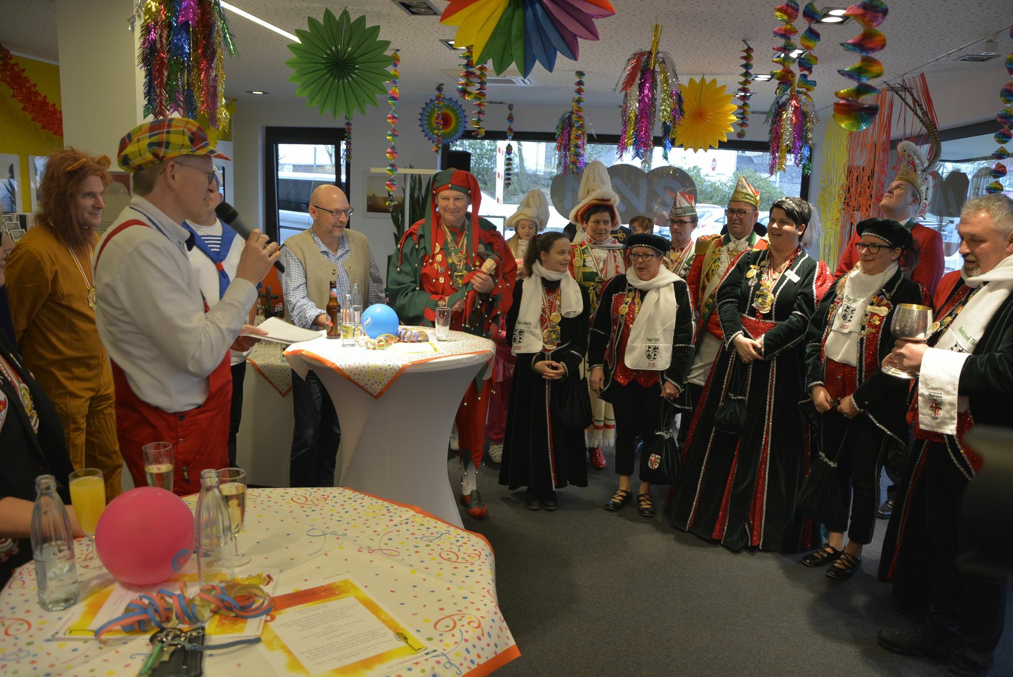 Von der EVM war Vorstandsvorsitzender Josef Rönz sowie Dr. Andreas Hoffknecht, technischer Geschäftsführer der Energienetze Mittelrhein, und Jürgen Zimmer, Bereichsleiter Netzservice, auf Einladung von Klaus Wisbar, Fachbereichsleiter Netzservice, nach Mayen gekommen. Auch der Aufsichtsratsvorsitzende der Stadtwerke, OB Wolfgang Treis, und sein Stellvertreter Dieter Winkel waren vertreten. Auch Heike Schmitz, Prokuristin der Stadtwerke, hieß den närrischen Besuch willkommen. Fotos: Kruft