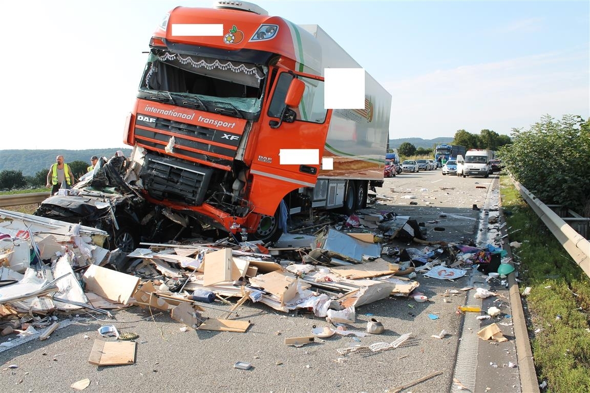 Den Rettungskräften bot sich ein Bild des Schreckens: Ein Wohnwagengespann wurde bei dem Unfall förmlich von einem Lkw zerquetscht. Aufgrund eines Verkehrsstaus musste der Fahrer des Gespanns auf Höhe Koblenz-Metternich anhalten. Ein niederländischer Lkw fuhr ungebremst auf das stehende Wohnwagengespann auf, und schob dieses auf einen davor stehenden Lkw. Der 58-jährige Fahrer wurde in den vollig zerstörten Pkw eingeklemmt. Er konnte von der Feuerwehr Koblenz mit schwersten Verletzungen befreit werden und wurde in ein Krankenhaus gebracht, in dem er wenig später seinen Verletzungen erlag. Die 54-jährige Beifahrerin konnte mit schweren Verletzungen aus dem Fahrzeug befreit werden. Der auffahrende Lkw-Fahrer erlitt leichte Verletzungen. Gegen ihn wird wegen des Verdachtes der fahrlässigen Tötung ermittelt. Der Lkw wurde von den Beamten der Autobahnpolizei Emmelshausen zur Klärung der Unfallursache sichergestellt. Die A 61 war in Richtung Norden von 9.15 bis 13.45 Uhr gesperrt. Foto: Autobahnpolizei Emmelshausen