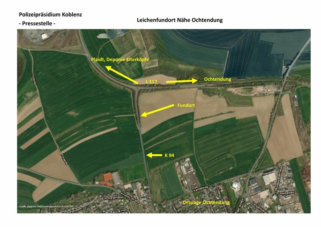 Die verbrannte Leiche, die von einer Spaziergängerin aufgefunden wurde, lag am Rand eines Feldweges an einer Böschung, parallel der K 94 aus Richtung Ochtendung kommend in Richtung Plaidt. Die Identität der Toten steht aktuell nicht fest. Zur Identifizierung der Person bzw. zur Ermittlung der Tathintergründe und des Täters wurde bei der Kriminaldirektion Koblenz die Sonderkommission "Ochtendung" eingerichtet, die die Ermittlungen, in enger Zusammenarbeit mit der Staatsanwaltschaft Koblenz, sofort übernommen hat. Nach dem vorläufigen Ergebnis der am 19. Dezember erfolgten Obduktion wurde die Frau erschossen. Bislang konnten, so die Polizei Koblenz, folgende persönliche Merkmale des Opfers erhoben werden:die Frau ist ca. 160 cm groß, ca. 55 kg schwer und ein heller Hauttyp. Sie hat schulterlanges rötlich-blondes, vermutlich gefärbtes Haar, welches zu einer Art "Dutt" am Hinterkopf zusammengebunden war. Sie weist eine helle Hautfarbe auf. Ihr Alter ist zurzeit noch schwer eingrenzbar. Forensische Untersuchungen zur Altersbestimmung werden durchgeführt. Nach derzeitigem Stand dürfte das Alter der Frau der ersten Lebenshälfte eines Menschen zu zuordnen sein. Konkrete Angaben zu getragenem Schmuck sind allerdings möglich:
