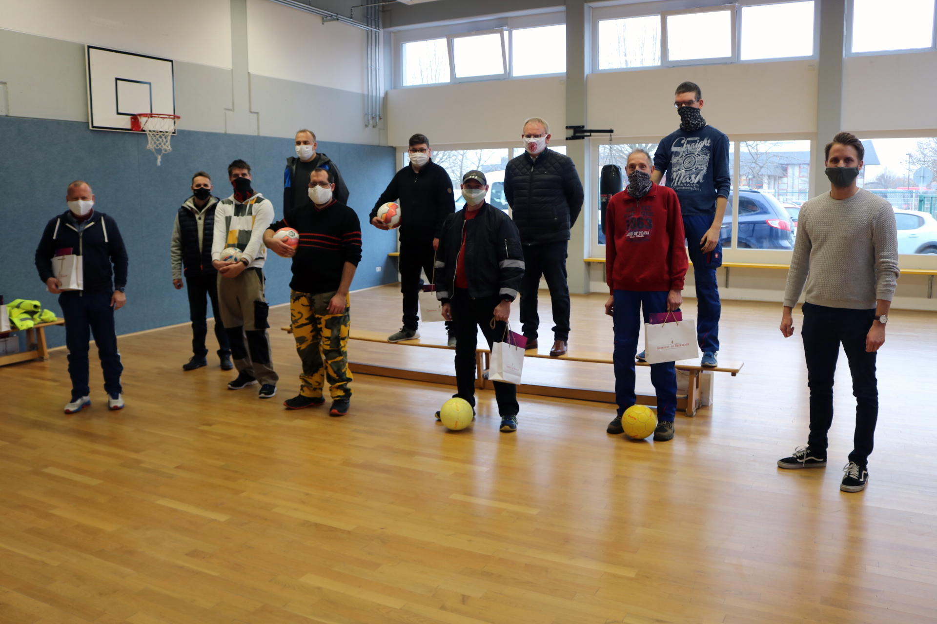 Im Rahmen der europäischen Fußballwoche hat der VfB Polch inklusive Fußball-Abende organisiert, die von vielen Fußballern des Maifeldes mitgestaltet wurden. Auch mehrere Einrichtungen der Behindertenhilfe waren in Polch am Start, so auch Kicker der Rhein-Mosel-Werkstatt (RMW) Koblenz. Jetzt besuchten der VfB-Vorsitzende Frank Breitbach und die beiden Übungsleiter der Trainingsabende, Wolfgang Durben und Uwe Klöckner, die Sportler der Rhein-Mosel-Werkstatt Koblenz. Gemeinsamer Tenor war, Corona zu trotzen. Und die Maifelder waren auch nicht mit leeren Händen gekommen. Als Motivationshilfe hatten sie umfangreiche Geschenke mitgebracht. Mit Sport-Shirts, Trikots und Winterjacken lässt sich nun Outdoor-Sport betreiben. Ebenso durfte ein Nasen-Mund-Schutz vom VfB Polch für alle Sportler nicht fehlen. Rechtzeitig zur Adventszeit gab es auch gut gefüllte Nikolaustüten und den Adventskalender des Fußballverbandes Rheinland. Sichtlich gerührt nahm RMW-Fußballer Christian Pischke die großzügige Spende entgegen und versprach den "Fußballkumpels aus Polch", dass man die Geschenke sinnvoll nutzen und fair aufteilen werde. "Der Besuch macht uns sehr stolz und glücklich", merkte Pischke freudig an und übergab den Polchern eine Fotocollage von den gemeinsamen Fußballabenden im Herbst. Der VfB-Vorsitzende Frank Breitbach bedankte sich im Namen seiner Delegation: "Wir wollten als VfB Polch in der schweren Zeit für unsere Freunde in den Einrichtungen auch ein Zeichen setzen und unserer sozialen Verantwortung als Sportverein gerecht werden. Wir werden auch in 2021 inklusiv aktiv sein und freuen uns auf die Fortführung unserer inklusiven Veranstaltungen mit tollen Sportlern." Foto: privat www.vfb-polch.de