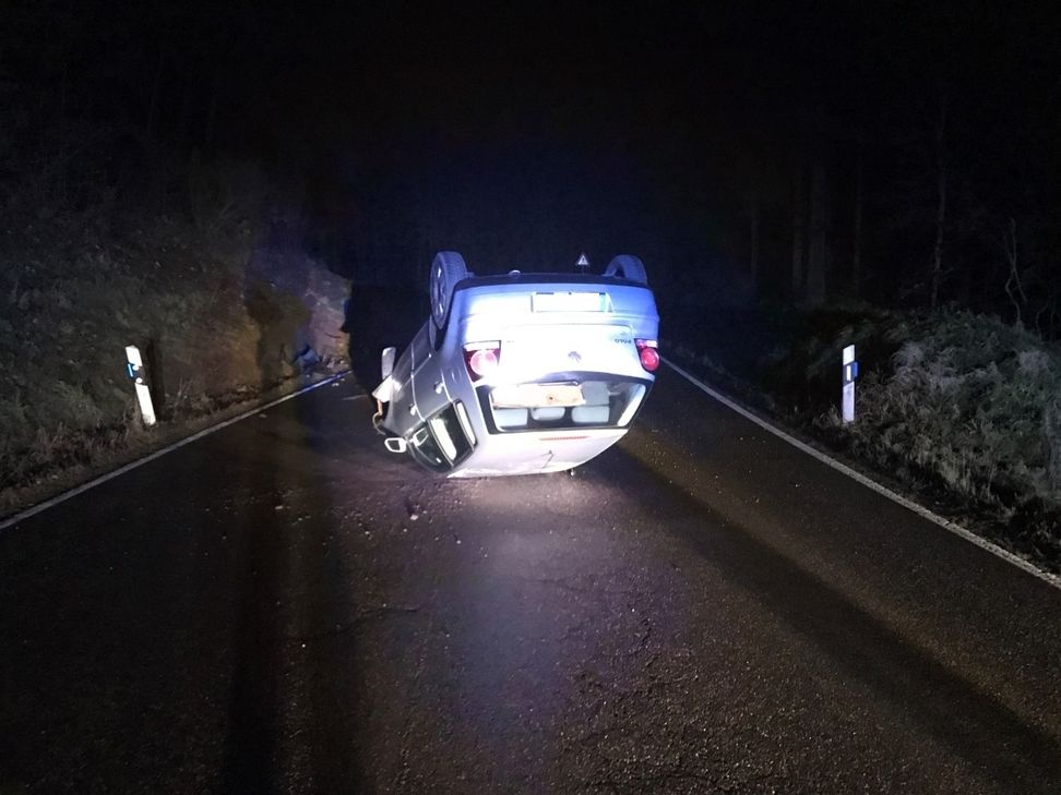 In einer Rechtskurve kam der 26-jährige Fahrer vermutlich aufgrund nicht angepasster Geschwindigkeit ins Schleudern. Das Auto drehte sich auf der Fahrbahn und prallte gegen die Böschung. Anschließend überschlug sich das Fahrzeug und blieb mitten auf der Fahrbahn auf dem Fahrzeugdach liegen. Foto: Polizei