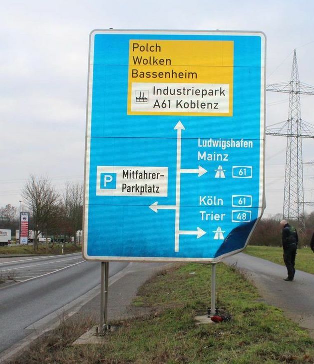 Der Fahrer eines roten Pkw war auf dem parallel zur L 52 verlaufenden Wirtschaftsweg, aus Richtung Metternich kommend, unterwegs. Hierbei kam er nach links vom Weg ab und prallte gegen das Schild, an dem ein Schaden von rund 3.000 Euro entstand. Aufgrund dieses Schadens geht die Polizei davon aus, dass der Pkw des Unfallverursachers ebenfalls nicht unerheblich an der linken Fahrzeugseite beschädigt wurde.