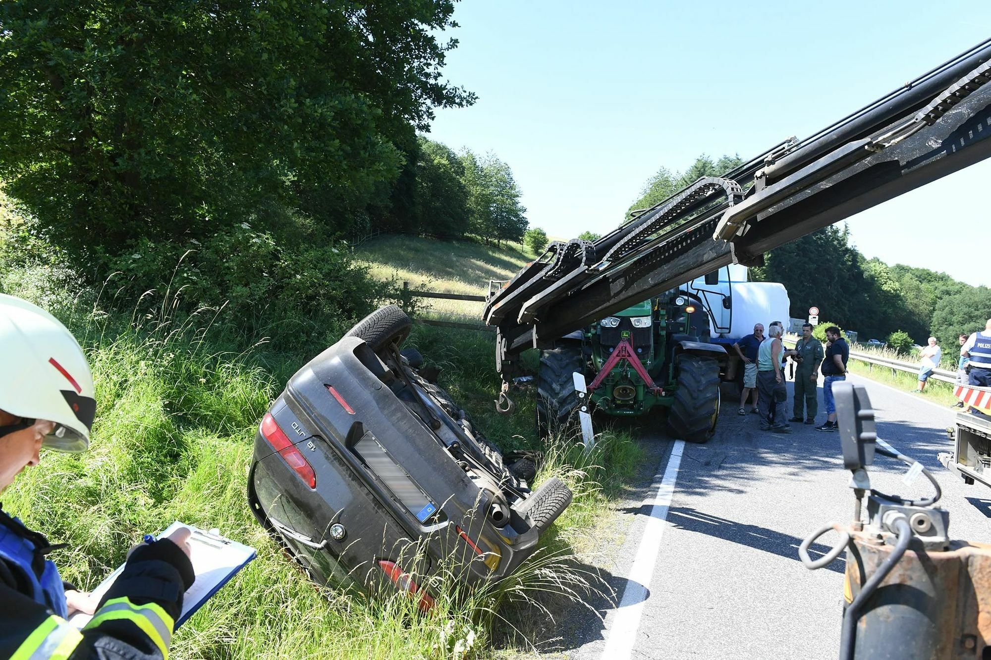 Dort kam es zu einem Unfall zwischen zwei Pkw und einer landwirtschaftlichen Zugmaschine. Der genaue Unfallhergang ist bislang noch nicht bekannt. Die L 98 war für die Zeit der Bergung voll gesperrt. Fotos: Walz