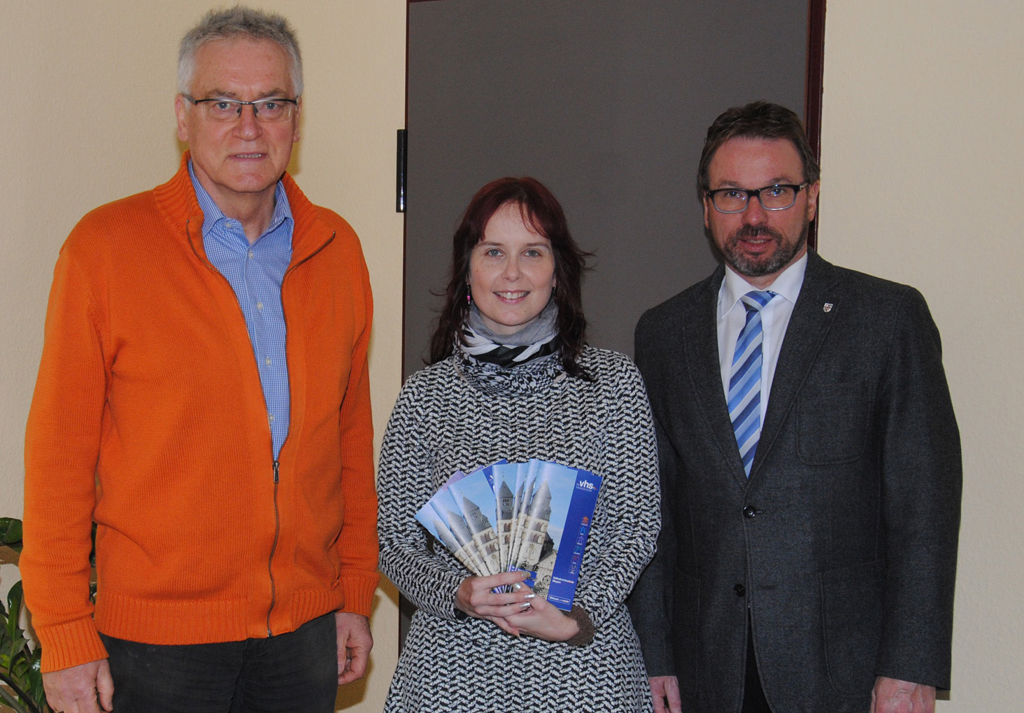 Josef Brodam (von links), Britta Schmaglinski und Oberbürgermeister Wolfgang Treis präsentieren den Arbeitsplan für das 1. Semester 2016.