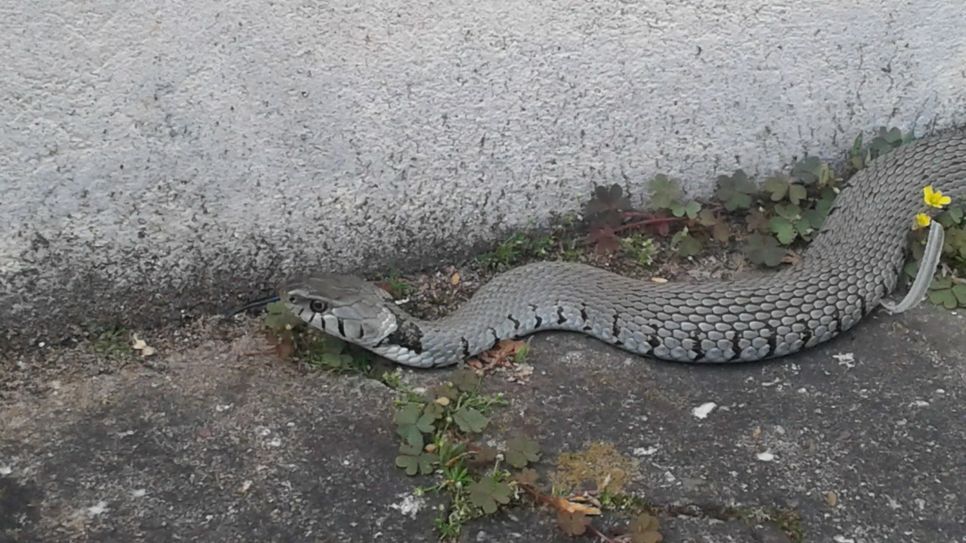 Er wisse nicht was er mit der Schlange machen soll. Als die Polizeibeamten vor Ort eintrafen, bestätigten sich die Angaben des Mitteilers. Die Polizeibeamten konnten das Tier einfangen und in einen Behälter stecken. Nach Abklärung mit dem Exoten-Gesundheitszentrum in Waldbreitbach konnte das Tier eindeutig als eine harmlose heimische Ringelnatter identifiziert werden und durch die Polizeibeamten in der Nähe eines Flusses (bevorzugter Lebensraum dieser Art) umgesiedelt werden. Foto: Polizei