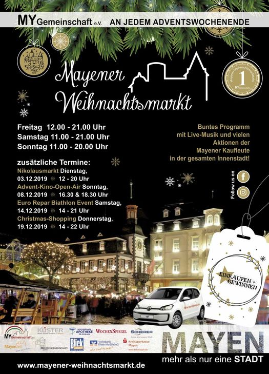 Das umfangreiche, reich bebilderte Heft bietet Wissenswertes und Interessantes rund um das Event - vom 29. November bis 22. Dezember auf dem Mayener Marktplatz. Die MY-Gemeinschaft – unterstützt von vielen Sponsoren (unter anderem WochenSpiegel) – sorgt auch in diesem Jahr wieder für ein buntes Programm mit vielen Aktionen der Mayener Kaufleute in der gesamten Innenstadt. Highlights sind der Nikolausmarkt, das Advent-Open-Air-Kino, das "Euro Repar" Biathlon-Event, das Christmas-Shopping und nicht zuletzt das große Gewinnspiel „Einkaufen und Gewinnen“ (Hauptpreis: VW Up!). Wer neugierig geworden ist sollte sich die Sonderveröffentlichung unbedingt anschauen. Unter diesem Link kann die Weihnachtsmarktzeitung heruntergeladen werden: http://www1.wi-paper.de/book/read/id/0002CC32907CD284