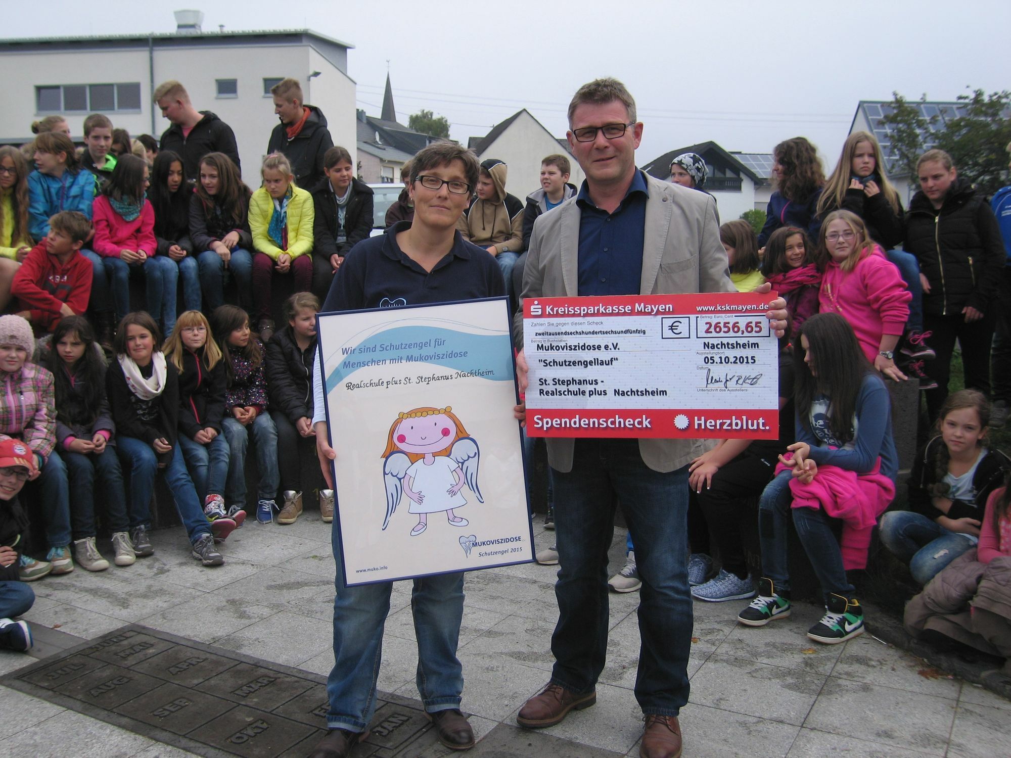 Der stellvertretende Schulleiter Ralf Heuft konnte jetzt einen Scheck in Höhe von 2656,65 Euro an Anke Mattern-Nolte vom Verein Mukoviszidose e.V. in Bonn überreichen. Diese bedankte sich bei der versammelten Schulgemeinschaft für das große Engagement mit einem Schutzengel-Zertifikat und versprach, dass das Geld in die Entwicklung von Therapiemöglichkeiten für die immer noch unheilbare Krankheit investiert werden soll. Insbesondere Kindern kann mit neuen Behandlungsformen inzwischen viel besser als noch vor zehn Jahren geholfen werden, so dass sich die durchschnittliche Lebenserwartung der Patienten auf inzwischen 40 Jahre verlängert hat. Dieser Erfolg konnte nur durch viele regelmäßige Spenden erreicht werden. Die Schulgemeinschaft hat die Botschaft verstanden: Es wird auch in diesem Schuljahr wieder einen Spendenlauf geben. Foto: privat www.realschule-plus-nachtsheim.de