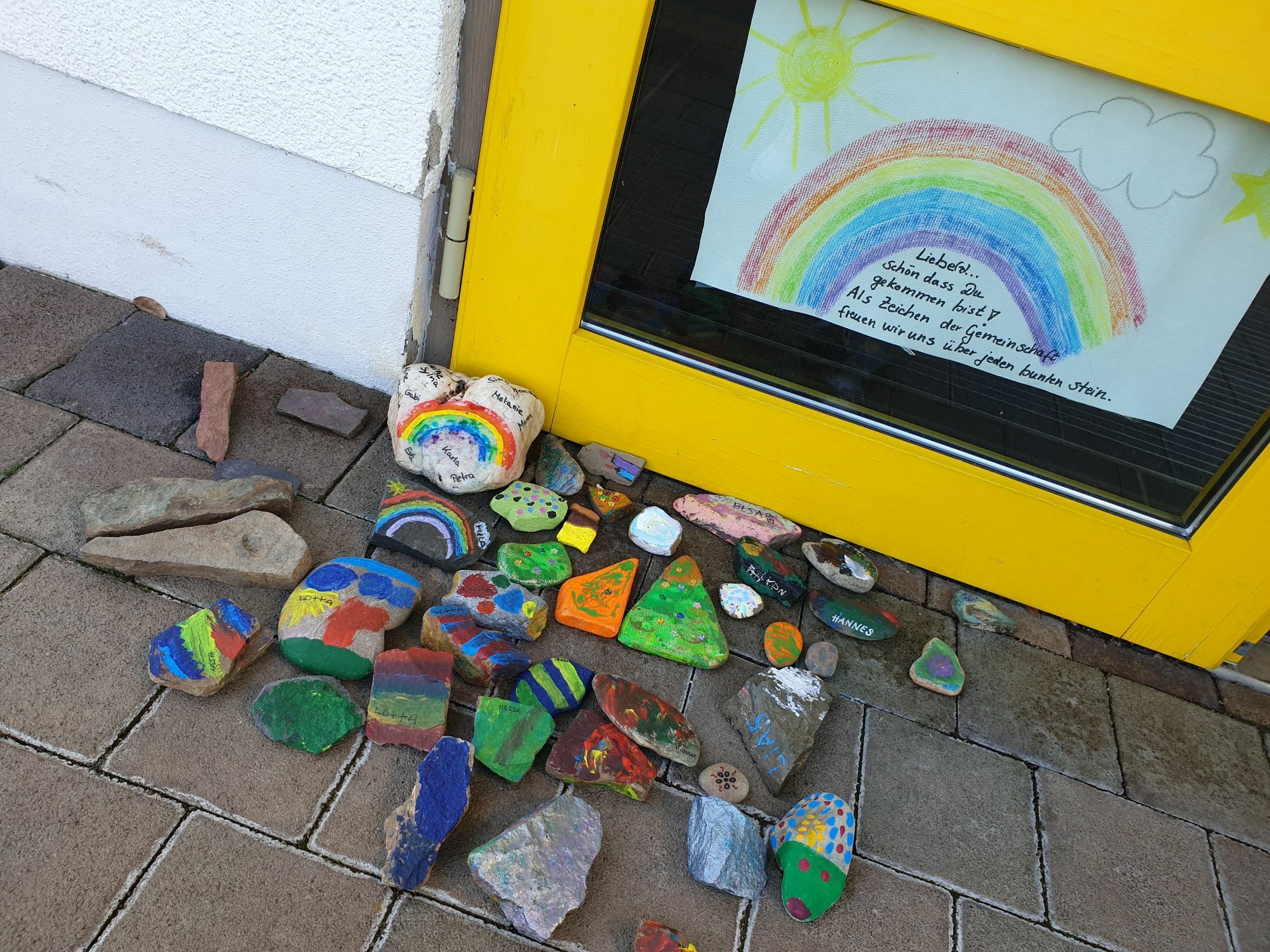 Aber trotzdem bewegt sich was und es entstand eine Idee. Inspiriert von der Regenbogen-Aktion, die die Kinder beim Spazierengehen zum Zählen animiert und die offensichtlich zeigt, dass man in der aktuellen Situation nicht alleine ist, wollte sich unsere Kindertagesstätte daran gerne beteiligen. Unter dem Motto „Wer mag, macht mit“ erhielten die Kinder in einem Brief eine kleine Aufgabe zum Vertreiben der Zeit. Regenbogen malen als Zeichen gegen Corona und Steine bemalen, als Zeichen der Gemeinschaft. Also hieß es „ran an die Farben“ und mitgemacht. Egal, ob mit Pinsel am Fenster oder Buntstiften auf dem Papier, in groß oder etwas kleiner - her mit den Regenbogen. Und damit man beim Spazierengehen noch etwas zu tun hat, konnten Steine gesammelt, bemalt und dann vor der Tür der Kindertagesstätte wieder abgelegt werden. Das Schöne an den Ideen ist, dass man ein Ziel hat und immer wieder Veränderungen sieht. Man sehen kann, dass wieder etwas dazu gekommen ist, man sich miteinander verbunden fühlt. Denn gerade das ist in der derzeitigen Situation besonders wichtig. Es ist schön zu sehen, wie gut die Aktion angenommen wird und es werden in der nächsten Zeit noch weitere Aktionen folgen, denn wir halten zusammen. Dann fällt auch das gegenseitige Vermissen vielleicht nicht so schwer.