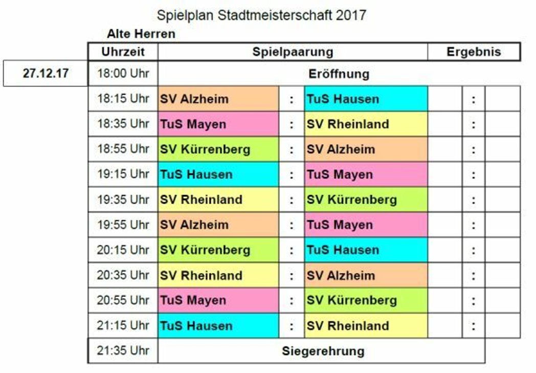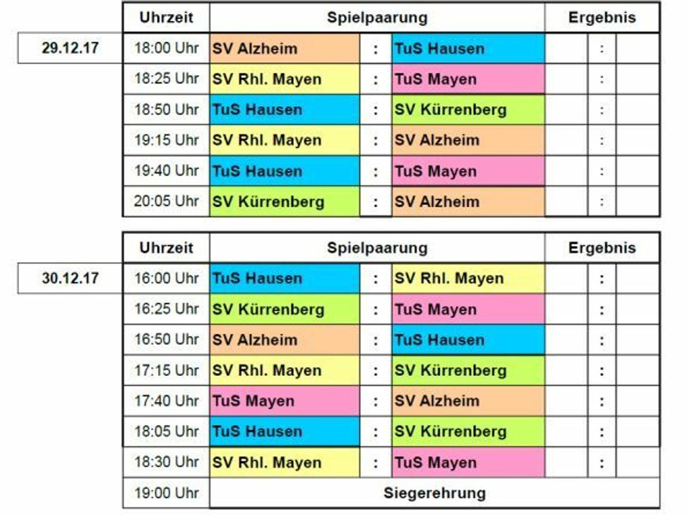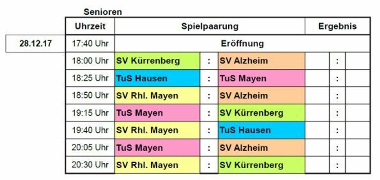 Am Mittwoch, 27. Dezember, 18.15 Uhr, spielen zunächst die Alten Herren um die "Hallenkrone". Ab Donnerstag, 28. Dezember, 18 Uhr, heißt es dann drei Tage Budenzauber mit dem TuS Mayen, dem SV Rheinland Mayen, dem TuS Hausen, dem SV Alzheim und dem Ausrichter SV Kürrenberg (Foto). Favorit ist naturgemäß der Rheinlandligist TuS Mayen. TuS-Trainer Thomas Reuter nimmt das Turnier auch ernst. "Wir spielen vor unseren Zuschauern und wollen ihnen eine gute Leistung zeigen", lässt Reuter keinen Zweifel aufkommen, wer den Titel gewinnen soll. Der ärgste Widersacher dürfte der A-Ligist Rheinland Mayen sein, der in der Halle gewohnt stark aufspielt. Für die drei C-Ligisten bleiben wohl nur Außenseiterchancen, oder sind es doch mehr? Start am Freitag ist um 18 Uhr und am Samstag um 16 Uhr. Foto: privat