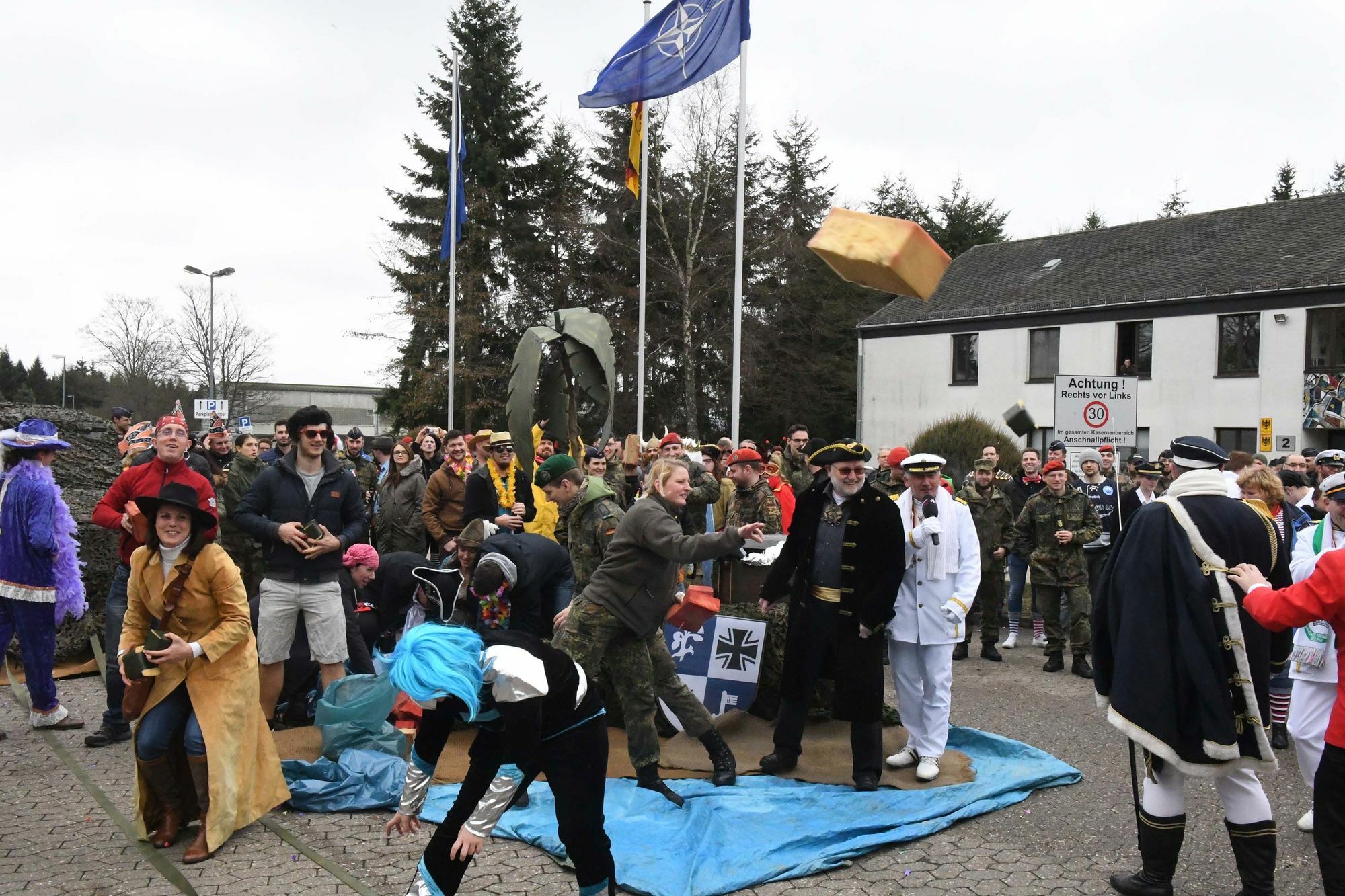 Das Wortgefecht an der Kasernen-Reling konnten die Soldaten noch für sich entscheiden. Oberstleutnant Kristian Schaum schenkte den Narren der Mayener Faasenaacht ordentlich ein. Vor allem Mayens Oberbürgermeister Wolfgang Treis bekam einige Breitseiten ab. „Letztes Jahr noch auf unserer Seite kämpfend und als möglicher künftiger Bundespräsident proklamiert, hat er jetzt das Lager gewechselt“, äußerte sich Oberstleutnant Schaum empört. „Außerdem hat er sich von ‚Steini‘ den Posten, den wir für ihn vorgesehen hatten, wegschnappen lassen“, ergänzte er. „Kapitän zur See“ Oberst Hans-Jürgen Heiß, stellvertretender Kommandeur und Chef des Stabes des Zentrum Operative Kommunikation der Bundeswehr, befehligte die Truppen in der Verteidigung. Ihm zur Seite stand allerhand politische Prominenz. Auf Seiten der angriffslustigen Narren standen neben Oberbürgermeister Treis unter anderem der Präsident der Mayener Karnevalsgesellschaft Alte Große, Christoph Schwab, Stadtkommandant Dieter Daheim von der Prinzengarde Mayen, zusammen mit seinem Kommandeur Albert Porz und Neu-Präsident Achim Welsch. Die Verteidiger hielten dem Ansturm der Narren nur kurz Stand und die Schlacht auf hoher See war rasch zu Gunsten der Karnevalisten entschieden. „Wir haben uns nach Kräften zur Wehr gesetzt. Es sollte einfach nicht sein“, sagte Oberst Heiß konsterniert. Im Anschluss an die Kasernenerstürmung begruben die Parteien das Kriegsbeil und feierten friedlich zusammen. Fotos: Walz