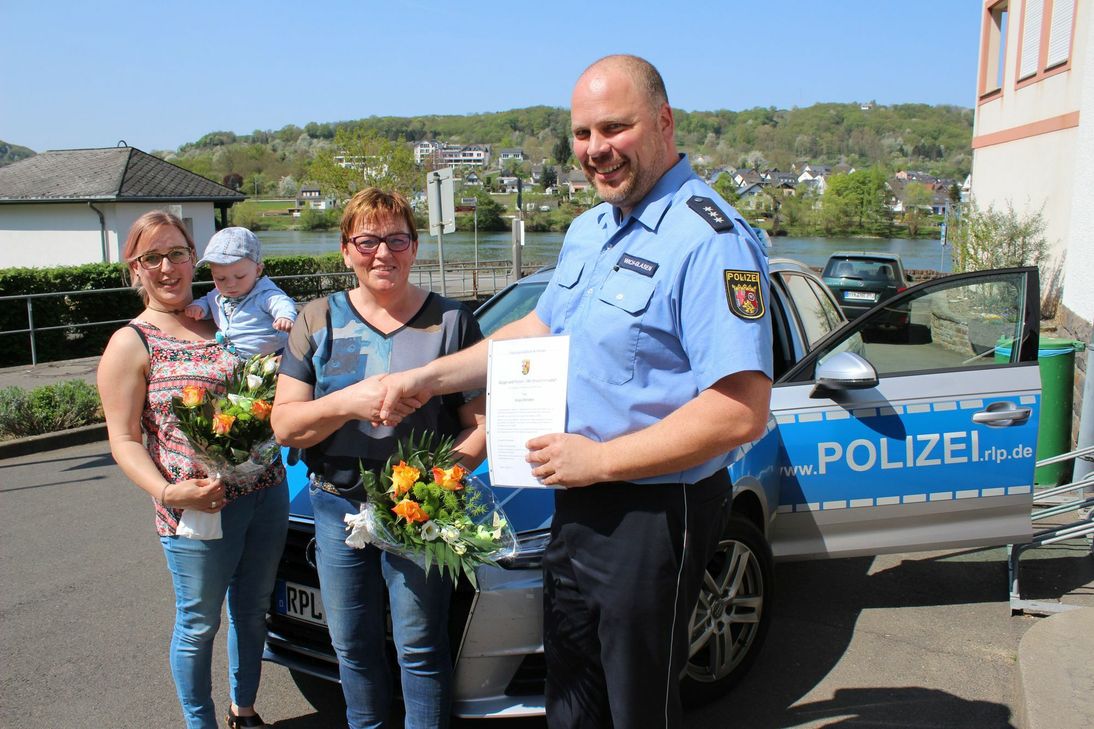 Rückblick: Am Nachmittag des 2. März waren Helga Menden, ihre Tochter Kathrin Leulleik und deren Sohn im Löhr-Center in Koblenz unterwegs, als sie eine ältere Frau bemerkten, die um Hilfe rief. Ihr Mann war auf einer Bank zusammengebrochen. Die beiden Frauen eilten zu Hilfe. Sie reagierten sofort. Setzten einen Notruf ab und begannen mit der Herzmassage. Der herbeigerufene Notarzt versuchte den kollabierten Mann ebenfalls noch zur retten. Doch trotz aller Reanimationsmaßnahmen kam leider jede Hilfe zu spät. Der Mann verstarb. Polizeihauptkommissar Andreas Wich-Glasen, Leiter der Polizeiwache Brodenbach, lobte den Einsatz der Helferinnen und bedankte sich mit einem Blumenstrauß bei den Moselanerinnen. "Sie haben Zivilcourage gezeigt. Sie haben nicht weggeschaut, sondern sich in beispielgebender Weise für einen anderen Menschen eingesetzt. Hierfür spreche ich Ihnen persönlich und im Namen der Polizei Rheinland-Pfalz meinen besonderen Dank aus", so die Worte des Polizeipräsidenten Karlheinz Maron in der überreichten Bürgerurkunde. Foto: Polizei