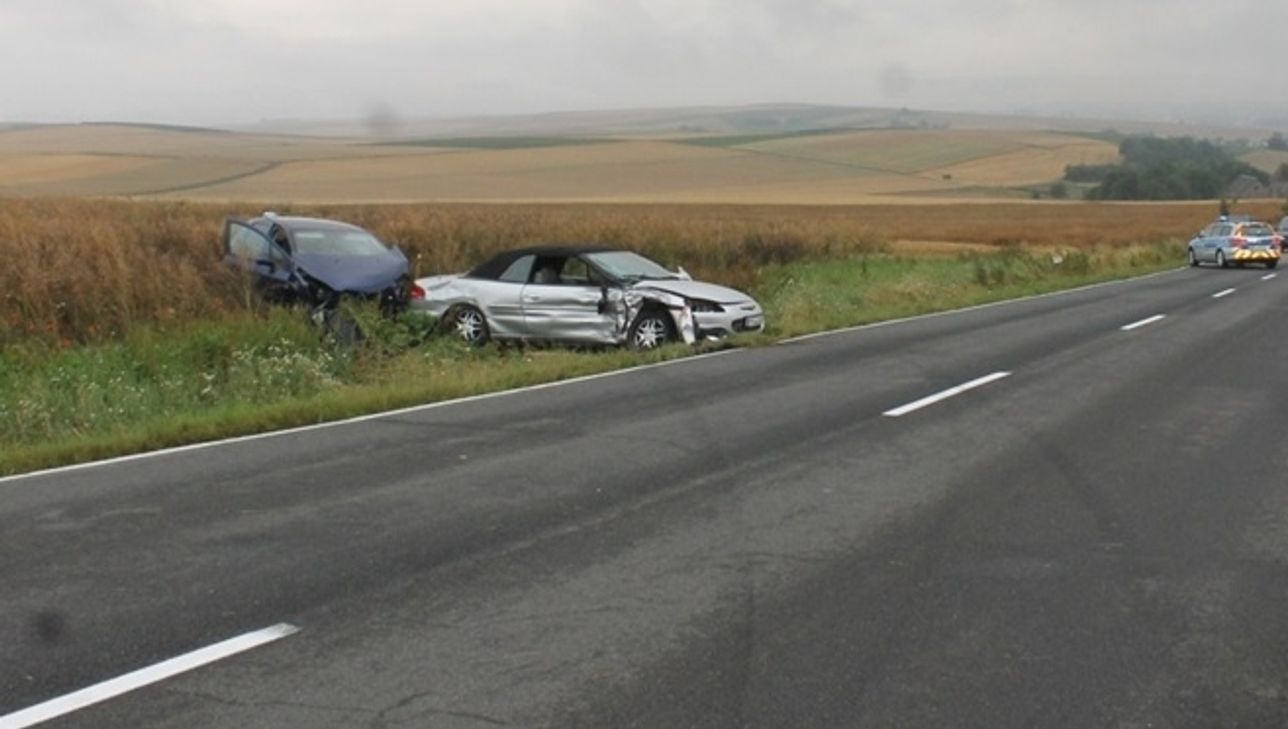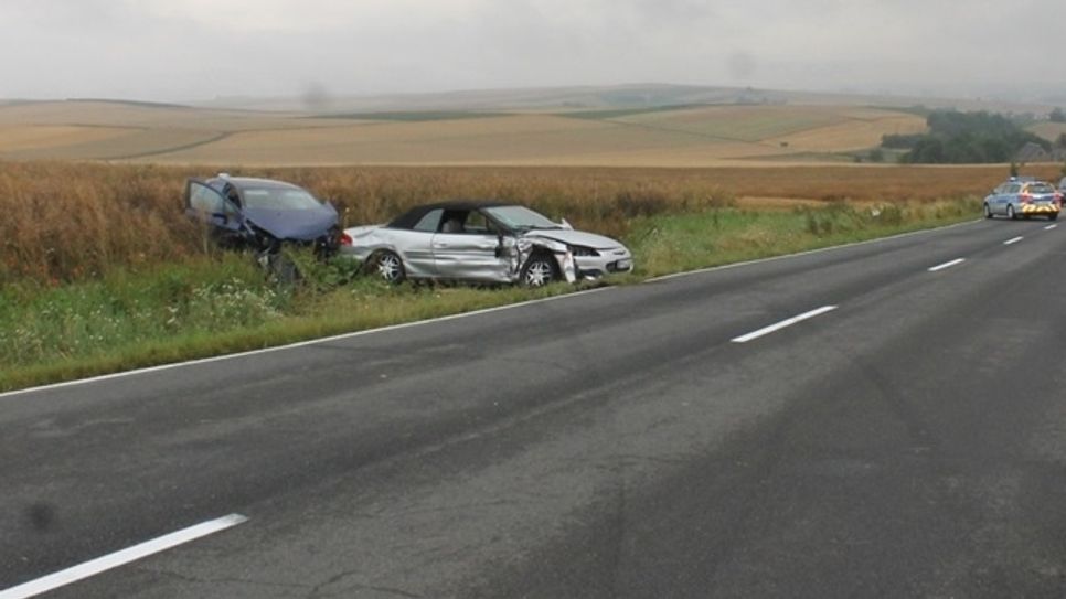 Im Ausgangsbereich einer scharfen Rechtskurve geriet eine Autofahrerin, die in Richtung Minkelfeld unterwegs war, auf die Gegenfahrbahn und stieß dort mit einem entgegenkommenden Pkw zusammen. Beide Fahrzeuge wurden von der Fahrbahn geschleudert. Der Fahrer des entgegenkommenden Autos wurde beim Unfallhergang schwer verletzt und ins Krankenhaus gebracht. Sein Beifahrer und die Autofahrerin erlitten leichte Verletzungen. Foto: Polizei