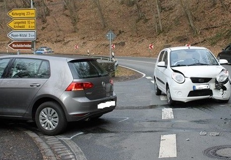 Im Einmündungsbereich der L 83/L10 sind zwei Fahrzeuge zusammengestoßen, wobei der aus Richtung Mayen kommende und nach links abbiegende offenbar den entgegenkommenden und vorfahrtsberechtigten Pkw übersah. Beide Fahrer wurden bei dem Unfall leicht verletzt. Die Pkw waren nicht mehr fahrbereit. Foto: Polizei