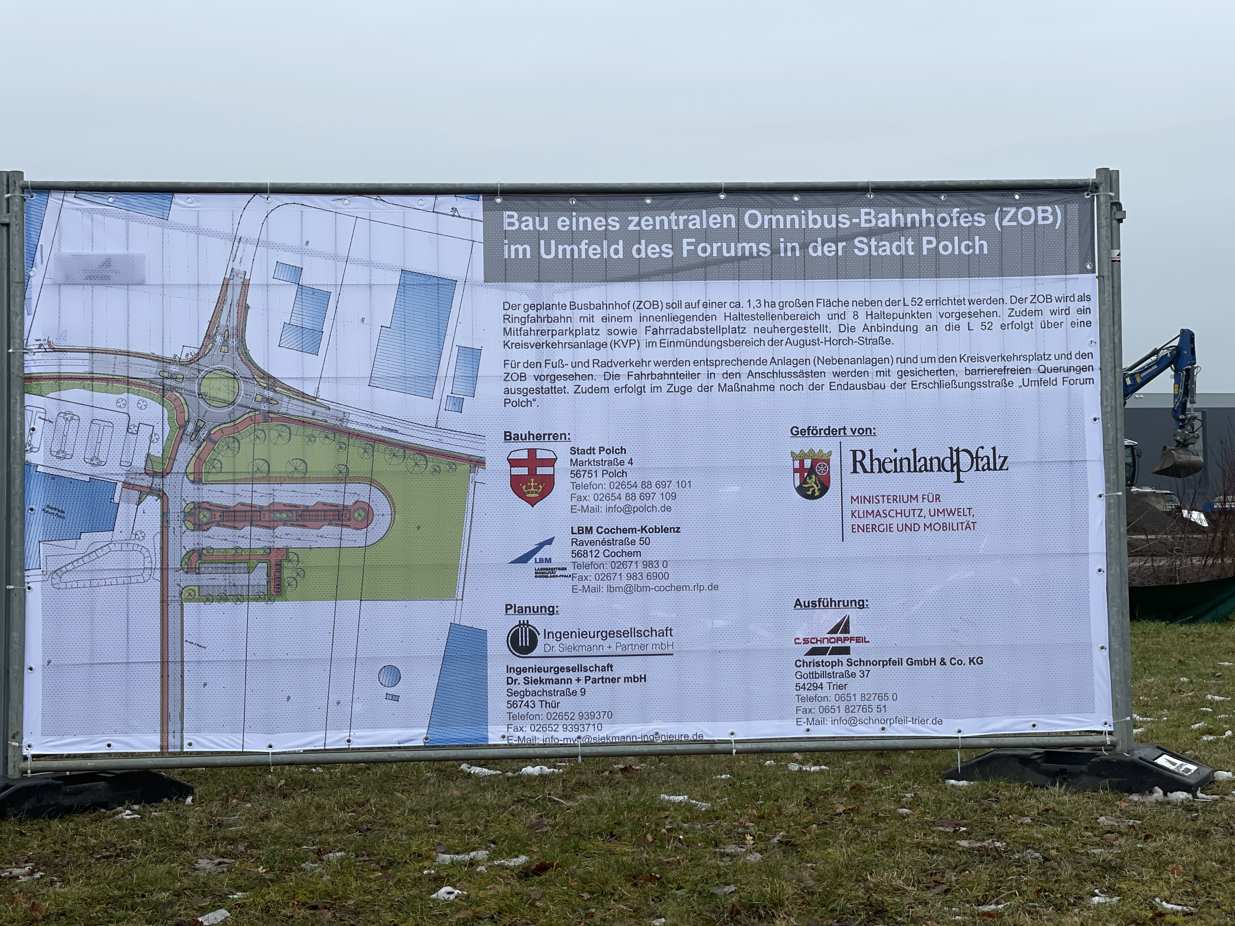 Stadtbürgermeister Gerd Klasen sprach von einem Meilenstein für die Zukunft und der zentralen Funktion der Stadt Polch für die Verbandsgemeinde und den gesamten Landkreis. Immerhin liegt der geografische Mittelpunkt von Mayen-Koblenz nur einen Steinwurf entfernt auf dem Dorfplatz in Ruitsch. Kreisbeigeordneter Jens Firmenich wünschte eine glückliche Hand für die nach der langen Planungs- endlich begonnene Realisierungsphase und zeigte sich sicher, dass der ZOB Polch den ÖPNV im gesamten Landkreis attraktiver machen wird. Bürgermeister Maximilian Mumm fand kritische Worte und prangerte die wegen der bürokratischen Hürden viel zu lange Planungsphase an. Gleichzeitig freute er sich auf den neuen ZOB, der den auf dem Parkplatz des Leo-Schönberg-Stadions provisorisch eingerichteten Busbahnhof ablösen wird, an dem teilweise zeitgleich acht Busse Gäste aufnehmen und wegfahren. Direkt nebenan wird ein Mitfahrerparkplatz sowie Fahrradabstellplatz gebaut. Die Anbindung an die L 52 erfolgt über einen Kreisel im Einmündungsbereich der August-Horch-Straße.