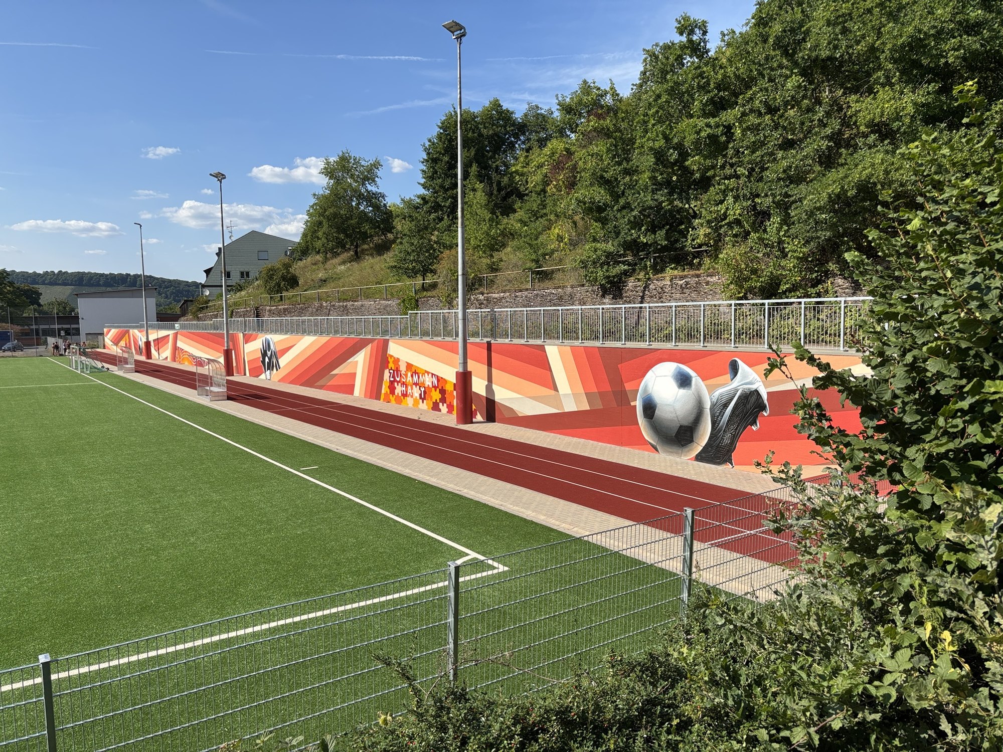 Zuerst der Sportplatz, jetzt die Mauer – im Anschluss an die Modernisierung des Sportplatzes in Wiltingen hat in den vergangenen Wochen auch die mehr als 140 Meter lange Mauer seitlich des Platzes ein neues Gesicht bekommen. Sie hat sich in ein riesiges, urbanes Kunstwerk verwandelt.