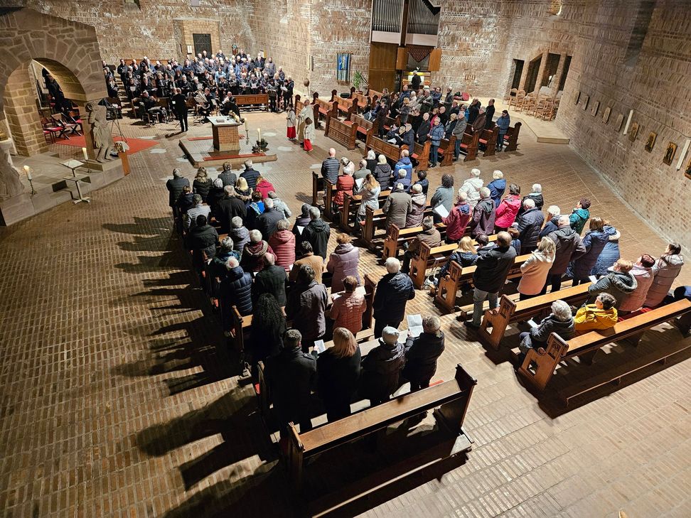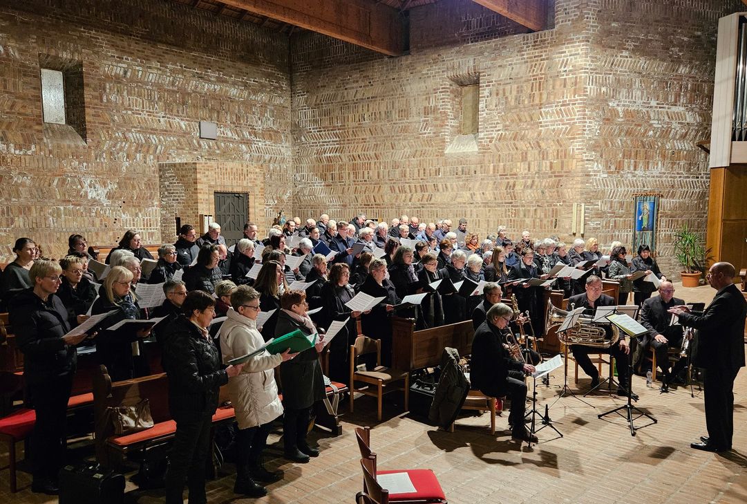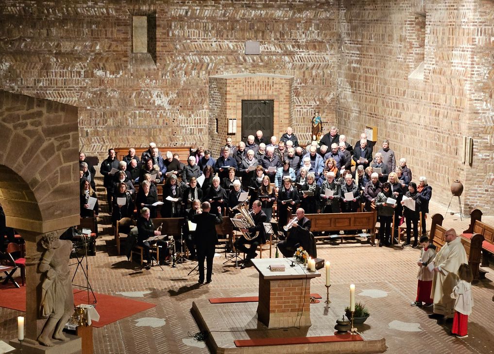Neben zum Fest Christkönig passenden Liedern erklang als Höhepunkt die „Messe brève“ von Léo Delibes. An der Orgel spielte Andreas Götten, der Gottesdienst wurde von Pfarrer Kai Georg Quirin zelebriert. Trotz widriger Witterungsbedingungen mit Eis und Schnee fanden sich rund 120 Besucherinnen und Besucher in der Kirche ein. Der Applaus und Dank aller Anwesenden fiel entsprechend herzlich aus.
