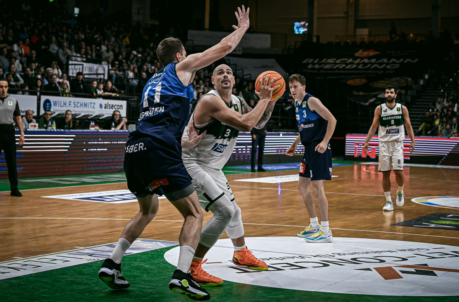 Im zweiten Viertel nahm die Physis der Partie merklich zu und beide Teams versuchten defensiv nochmal einen Gang hochzuschalten. Den Eisbären gelang es nun die Trierer Big Men defensiv besser unter Kontrolle zu bringen und offensiv kreierte man aus dem Pick and Roll und Pick and Pop immer wieder freie Abschlüsse. Doch die Gäste von der Mosel fanden gute Lösungen gegen die verbesserte Defense der Bremerhavener und so übernahmen die Trierer Guards nun viel Kontrolle in der Offensive. So führten die Gladiatoren zur Mitte des zweiten Viertels knapp mit 30:28 (15. Spielminute). Bis zum Ende der ersten Halbzeit erhöhte sich die Wurfquote der Gastgeber merklich und das Pick and Roll der Eisbären führte immer wieder zu freien Würfen. So wechselte die Führung zur Halbzeit und mit 40:44 ging es für die Gladiatoren in die Kabinenansprache.