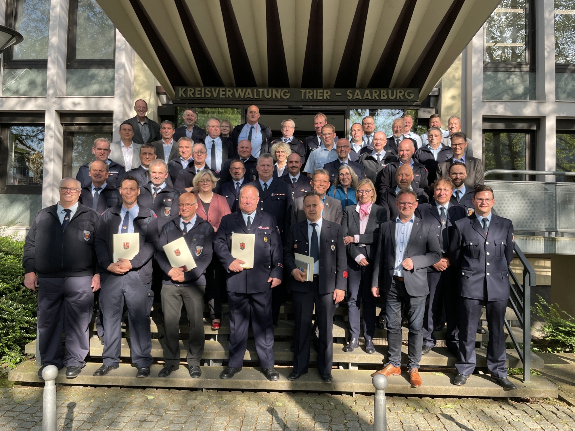 In einer Feierstunde in der Kreisverwaltung hat Landrat Stefan Metzdorf 22 Feuerwehrleute für ihr langjähriges Engagement mit dem Goldenen Feuerwehrehrenzeichen ausgezeichnet. Mit 35 und 45 Jahren können die verdienten Wehrleute aus den Verbandsgemeinden (VG) Ruwer und Schweich auf eine lange Zeit in ihrer Freiwilligen Feuerwehr zurückblicken. Im Beisein der Bürgermeisterin der VG Ruwer, Stephanie Nickels, der Bürgermeisterin der VG Schweich, Christiane Horsch sowie einiger Ortsbürgermeister:innen und der Wehrleitungen, erhielten die Feuerwehrleute ihre Ehrung. „Sie haben eine Heimat in der Feuerwehrfamilie gefunden. Für Ihren langjährigen Einsatz für die Sicherheit der Bürgerinnen und Bürger, spreche ich Ihnen im Namen des Kreises meinen herzlichen Dank aus“, so Landrat Stefan Metzdorf. Der ehrenamtliche Einsatz erfolge auch unter der Gefahr für die eigene Gesundheit. „Ich wünsche Ihnen, dass Sie immer wieder sicher von Ihren Einsätzen zurückkommen“, sagte Metzdorf.