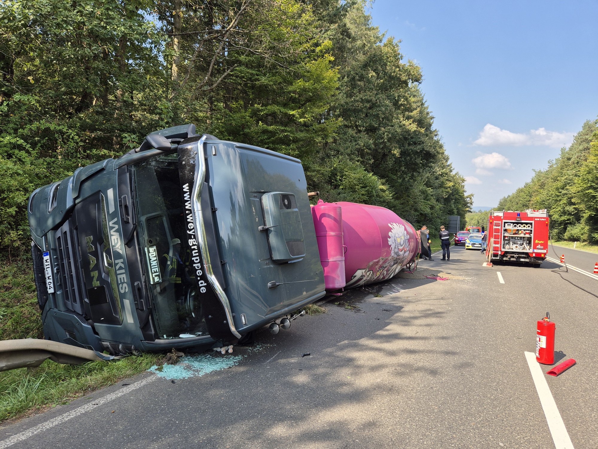 In der Folge muss nun ein Spezialbergungsunternehmen aus Trier mit einem Kran anrücken, um den Betonmischer wieder aufzurichten. Der Beton auf der Straße muss ebenfalls noch aufwendig entfernt werden.