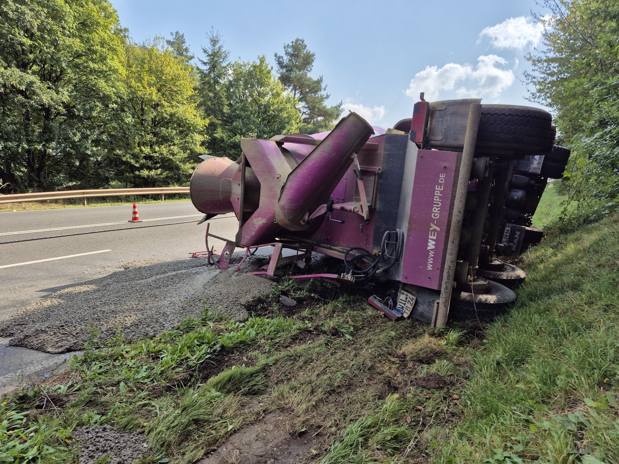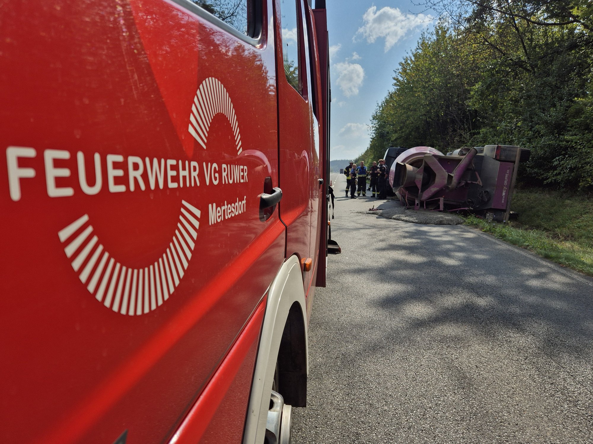 Wie die Polizei berichtet, ist aus bislang ungeklärten Gründen ein Betonmischer- LKW rechts von der Fahrbahn abgekommen und im Straßengraben umgestürzt. In der Folge flossen große Mengen Beton aus und liegen auf die Fahrbahn. Der Fahrer konnte sich glücklicherweise aus seinem Fahrzeug befreien und kam nach medizinscher Versorgung vor Ort mit dem Rettungswagen in ein Trierer Krankenhaus.