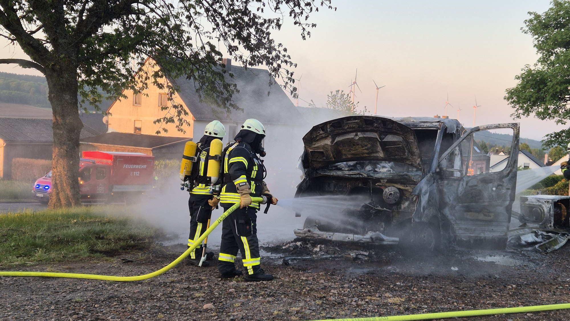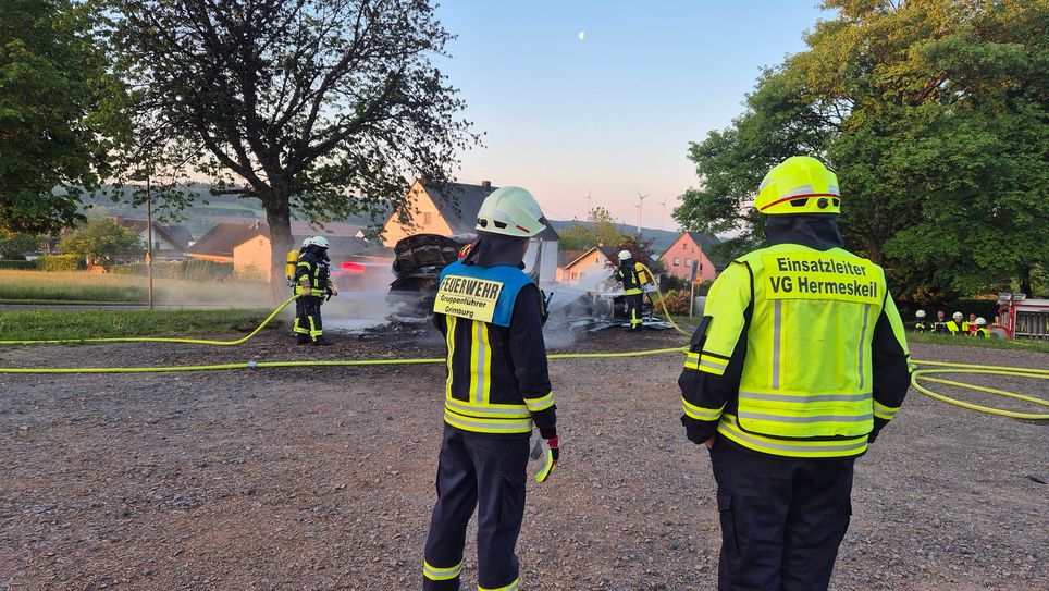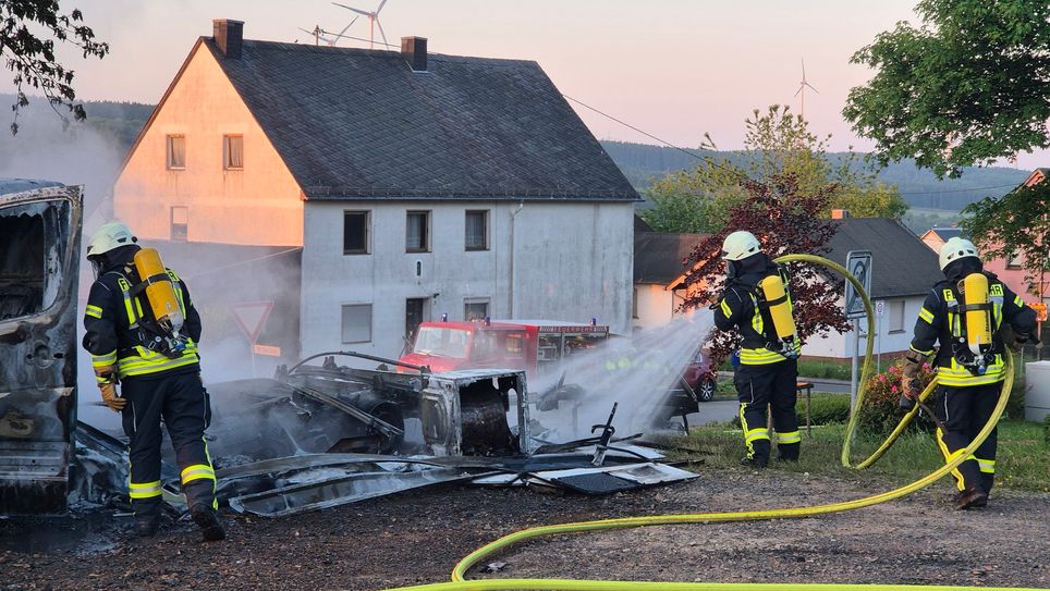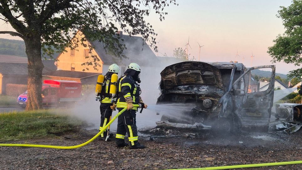 Am frühen Sonntagmorgen, dem 18. Mai, gegen 5:30 Uhr, wurde ein Brand am Sportplatz in Gusenburg gemeldet. Ein auf einem unbefestigten Parkplatz unter einem Baum abgestellter Transporter stand aus bislang ungeklärter Ursache plötzlich in Vollbrand.